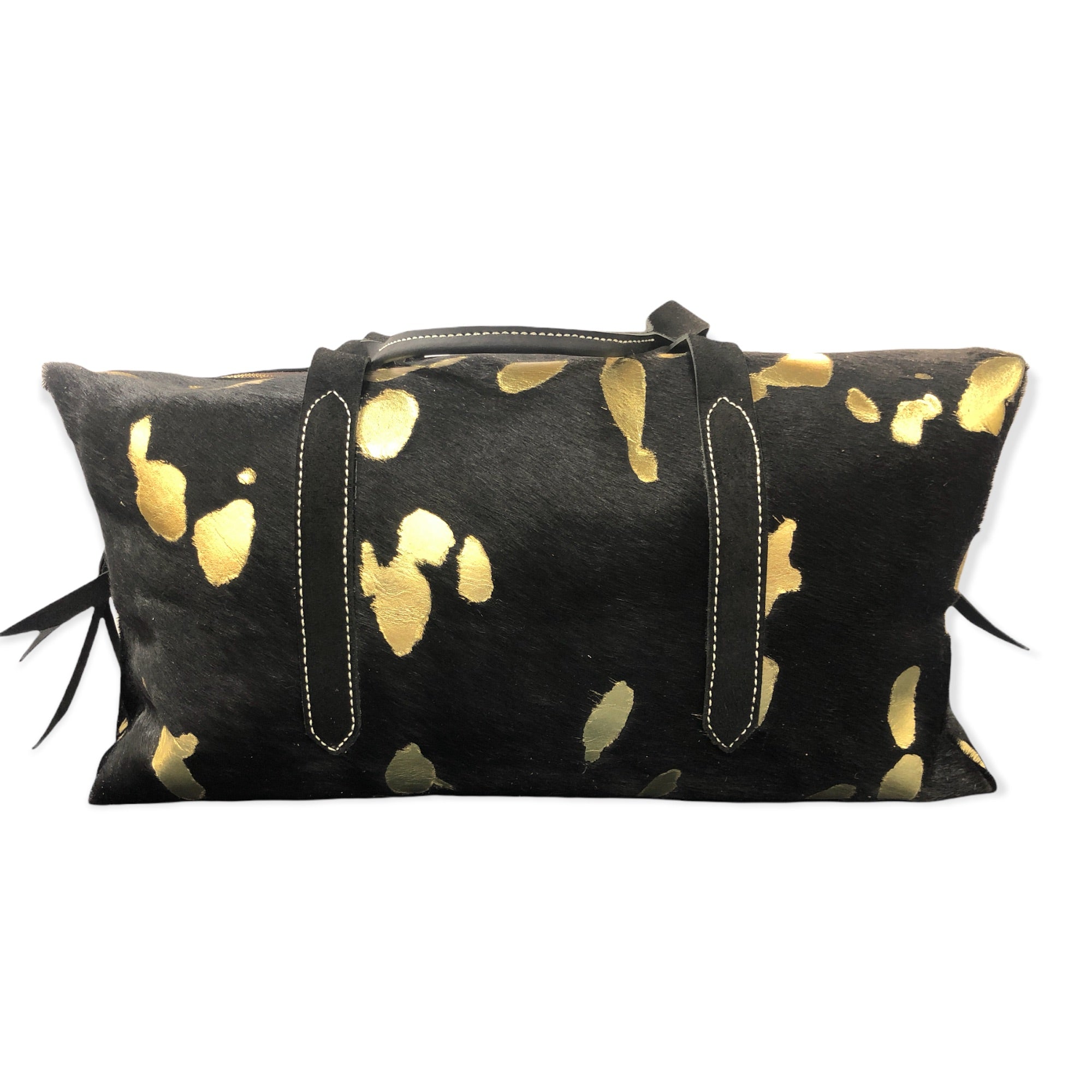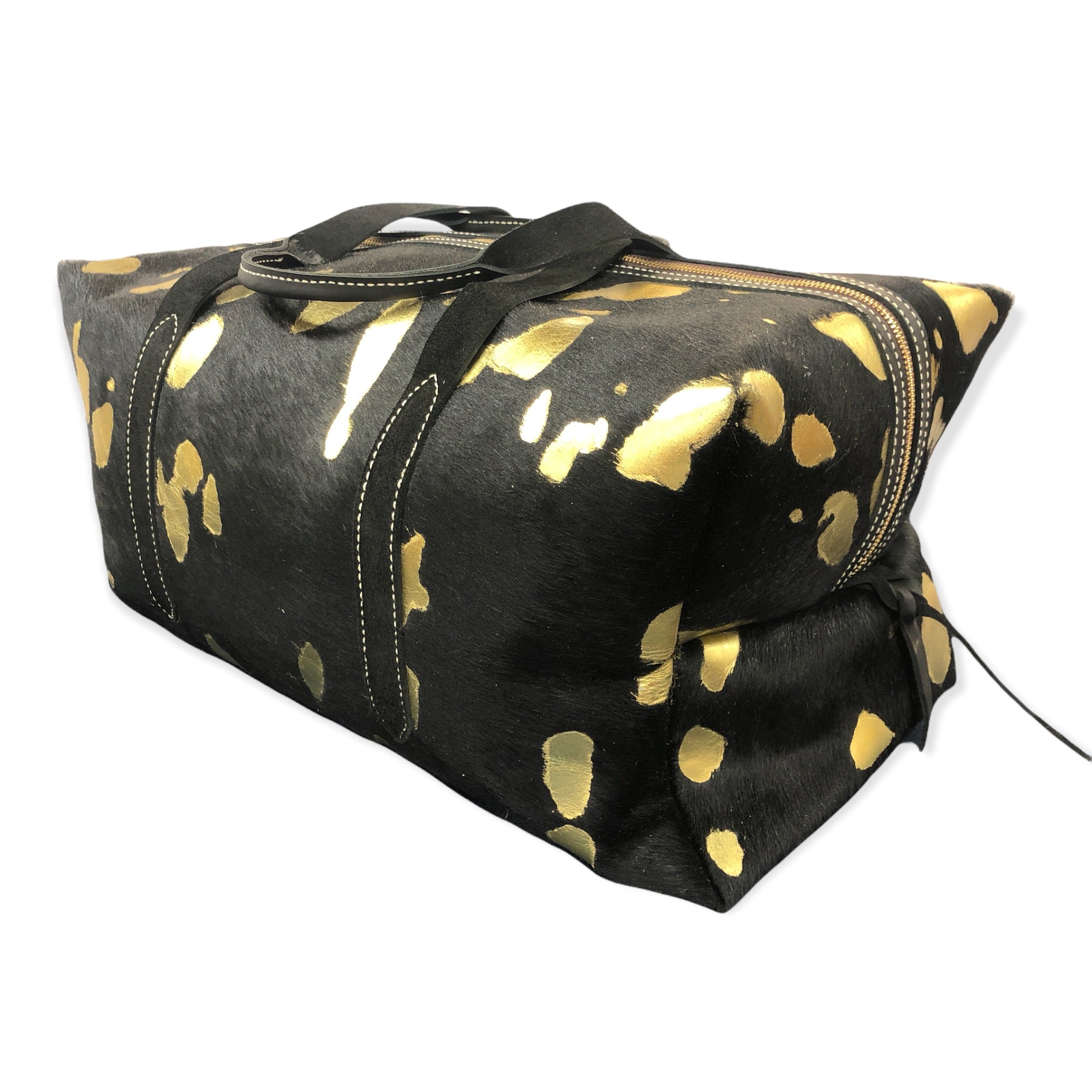 • Made from black hair on cowhide with gold acid wash. • Lined with cream and gold polka dot liner. • Measures 19”x10”x10”