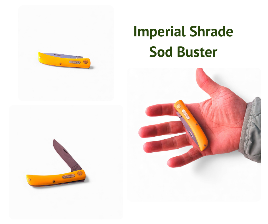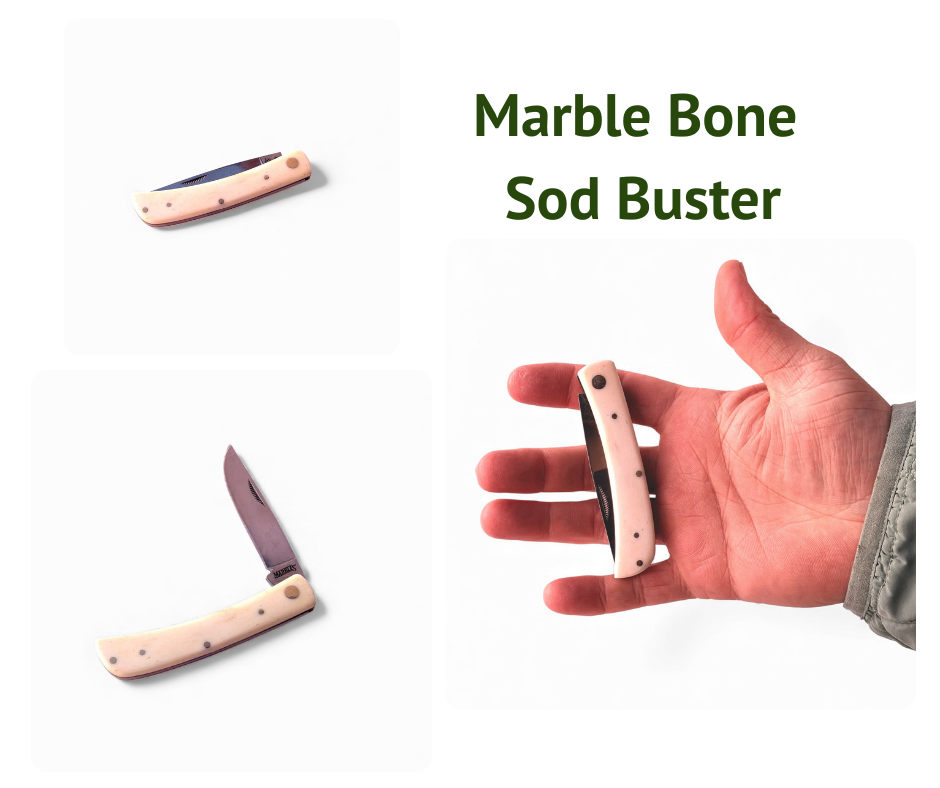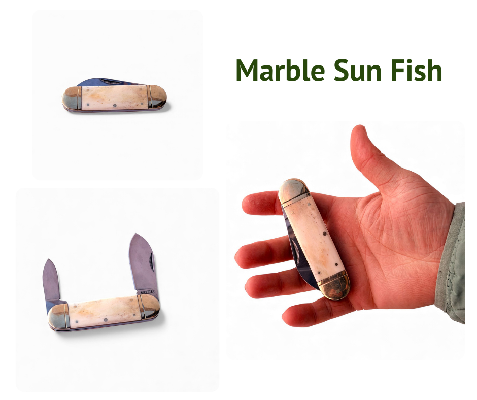The trappers are all the classic 4.25” size with white natural bone. The yellow and bone sodbusters are typical jr. sb size. The sunfish and cotton sampler are a little larger profile but still fit well in most belt scabbards.