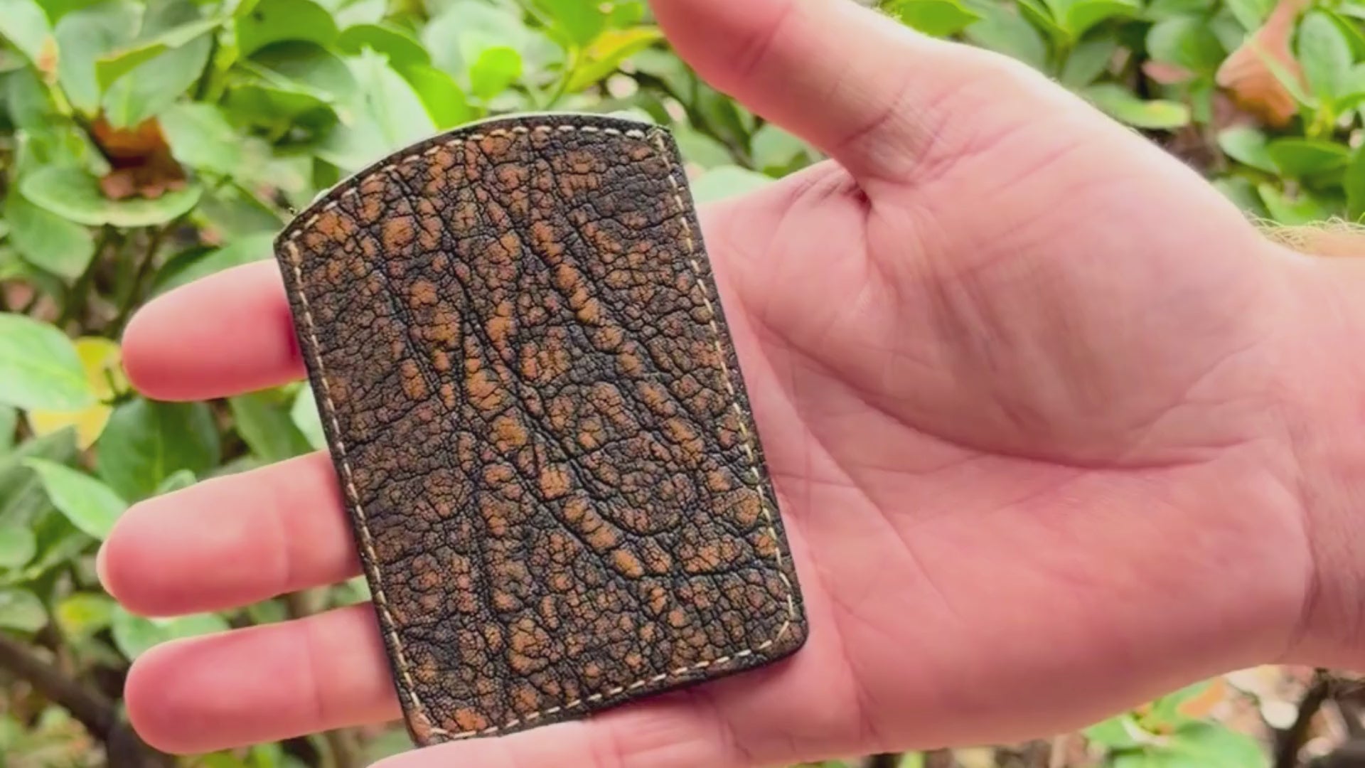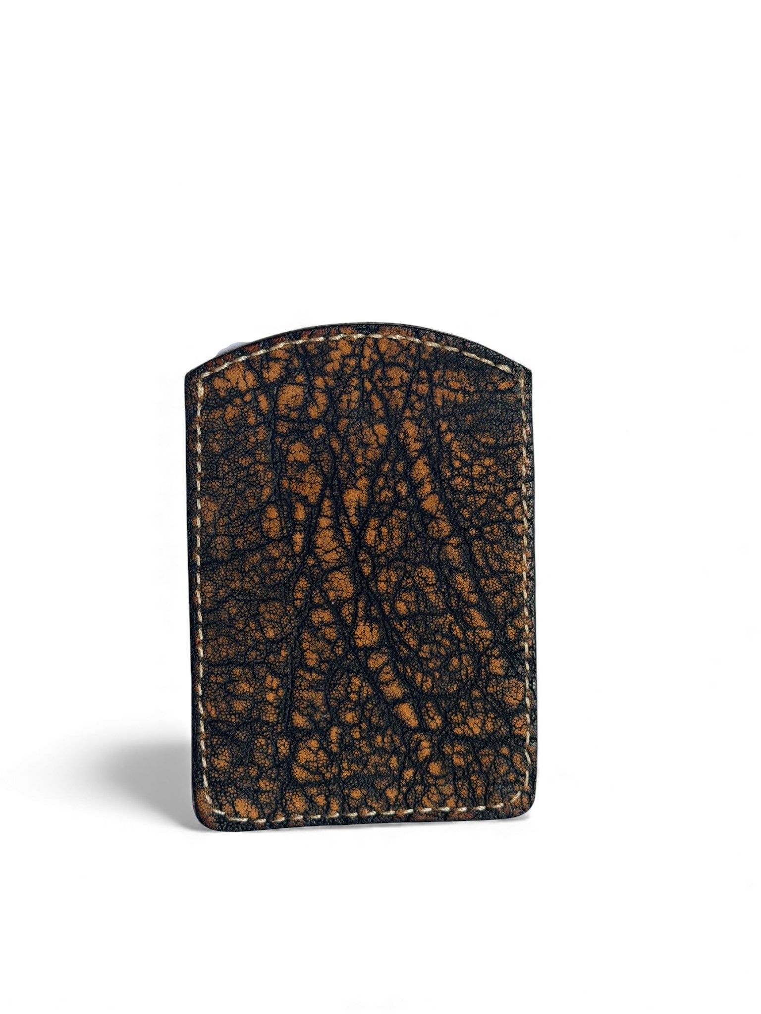 Crafted from premium Namibian elephant leather, this wallet pairs a tooled back panel with a smooth, reliable ribbon-pull mechanism. Pull the ribbon to lift your cards for quick access; push them back down and the ribbon disappears into place. You can tuck folded cash inside too, and the mechanism will raise it out just like a card.