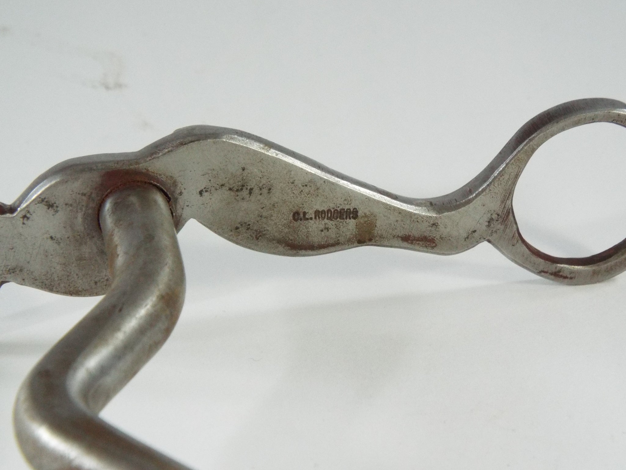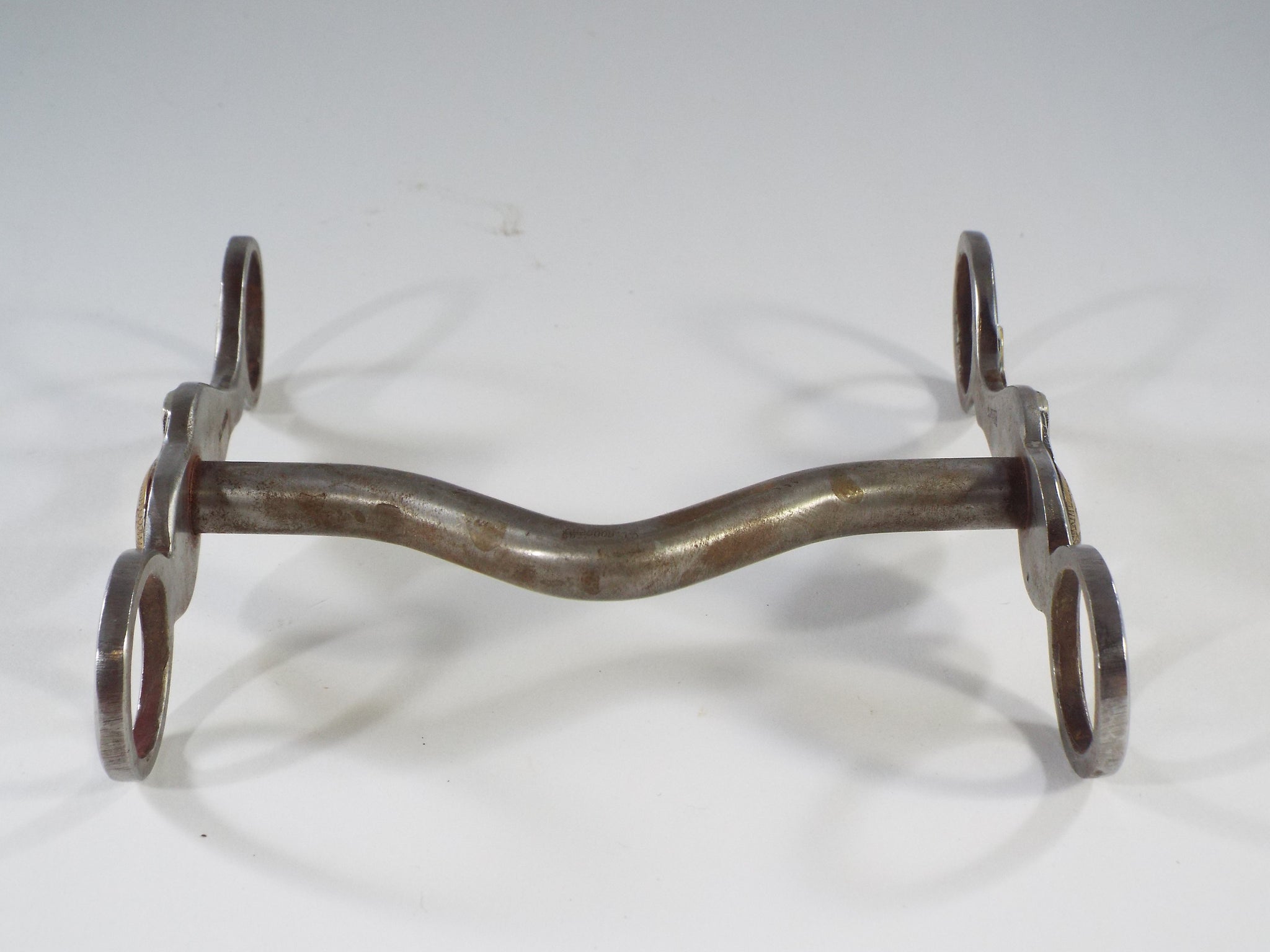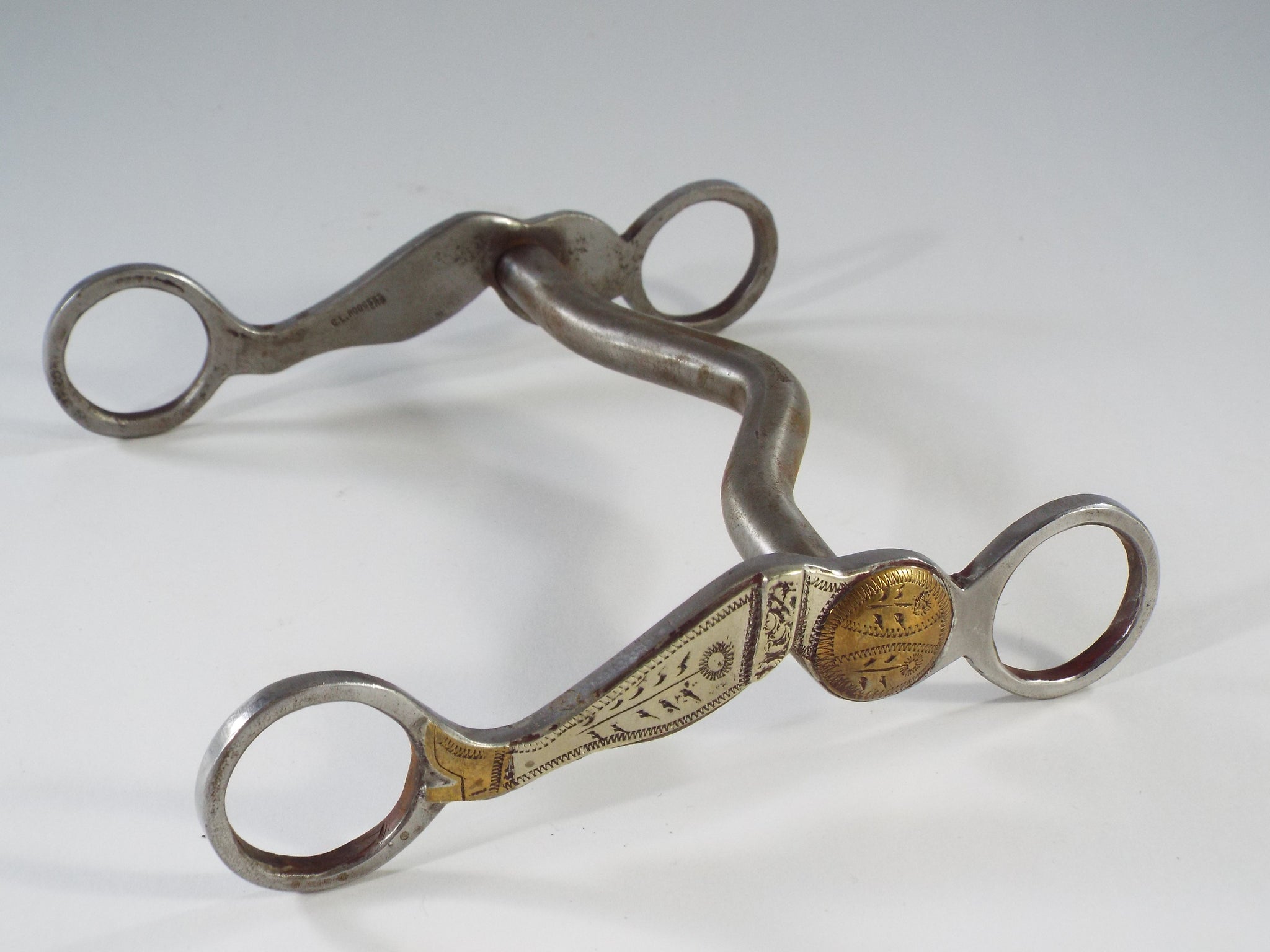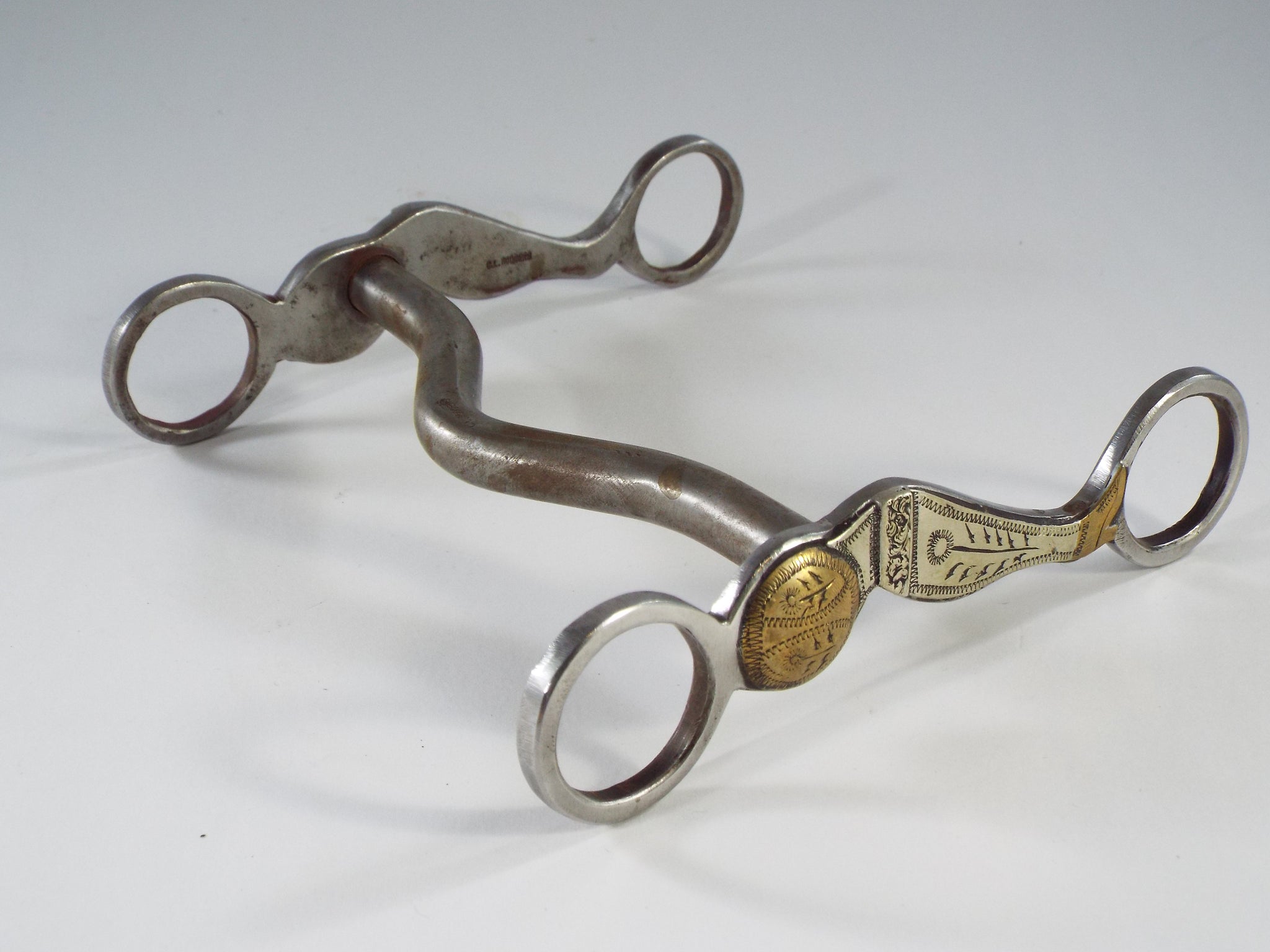 This is a brand new solid mouth bit. It was made by Clyde Rogers and is mounted with four pieces of engraved brass and four pieces of engraved silver. The shanks are the classic gal legs. The mouth has a low port.