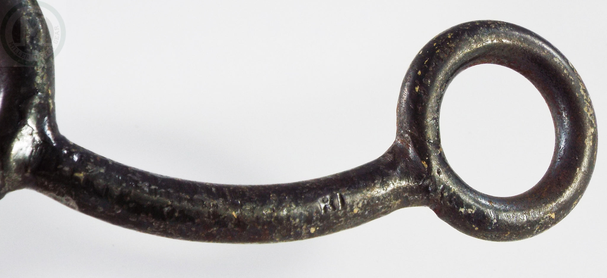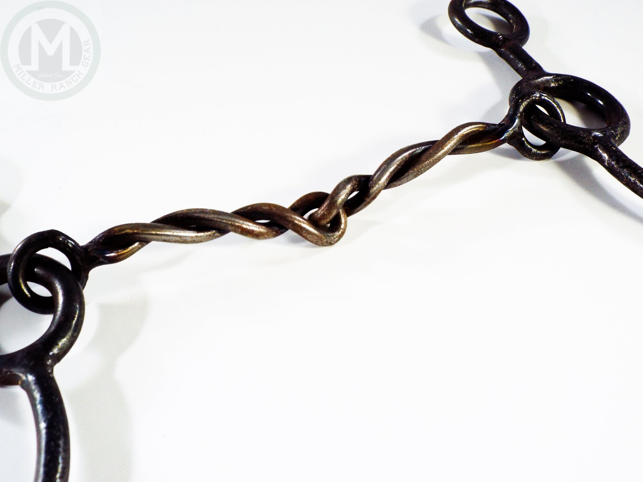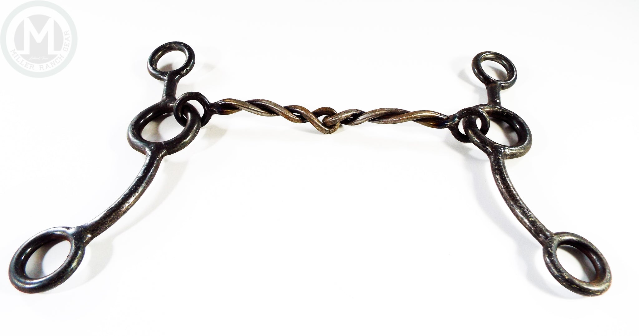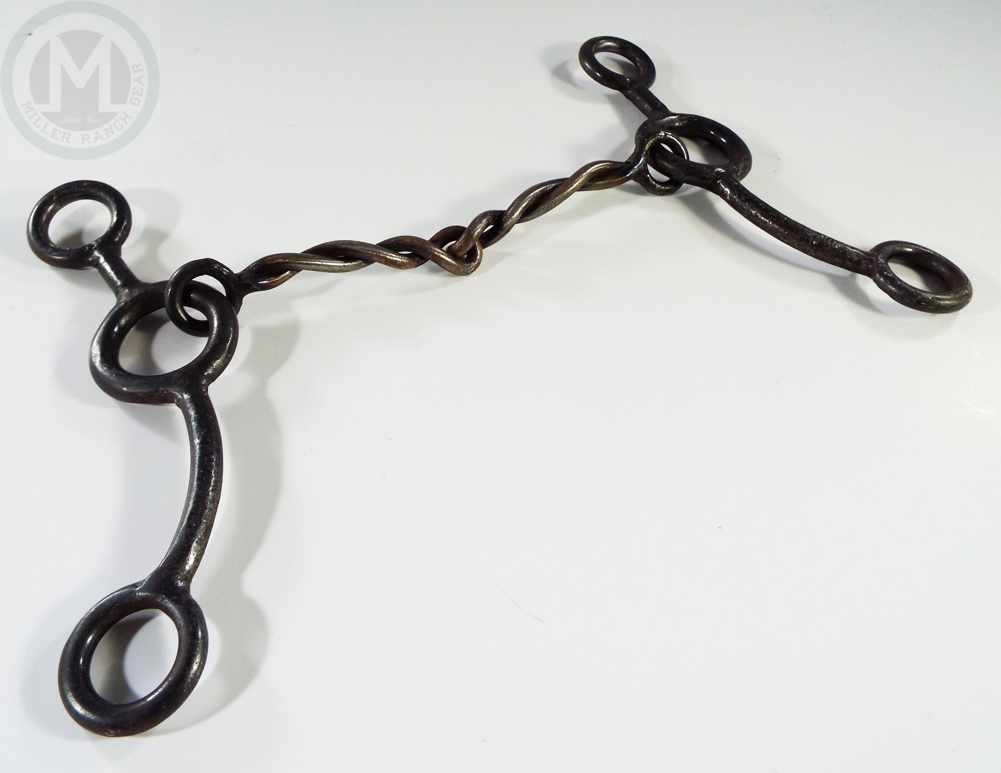 This is a junior cow horse twisted wire mouth snaffle bit made by maker Rod Teuscher out of Gainesville, Tx. It is marked RT.