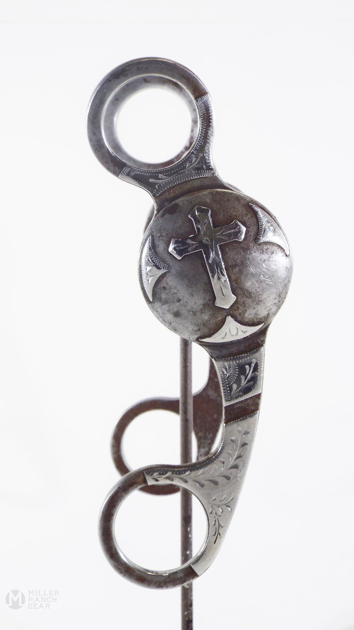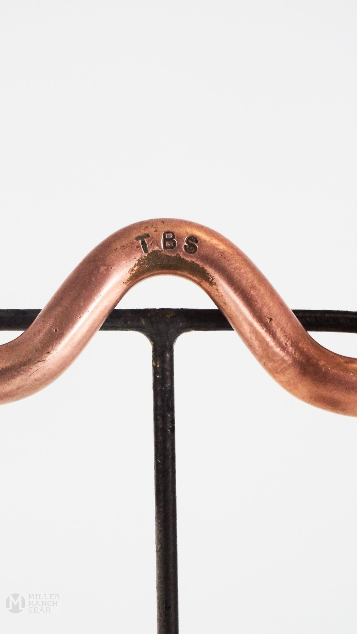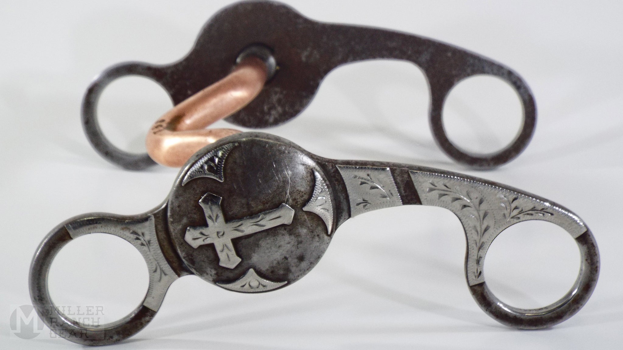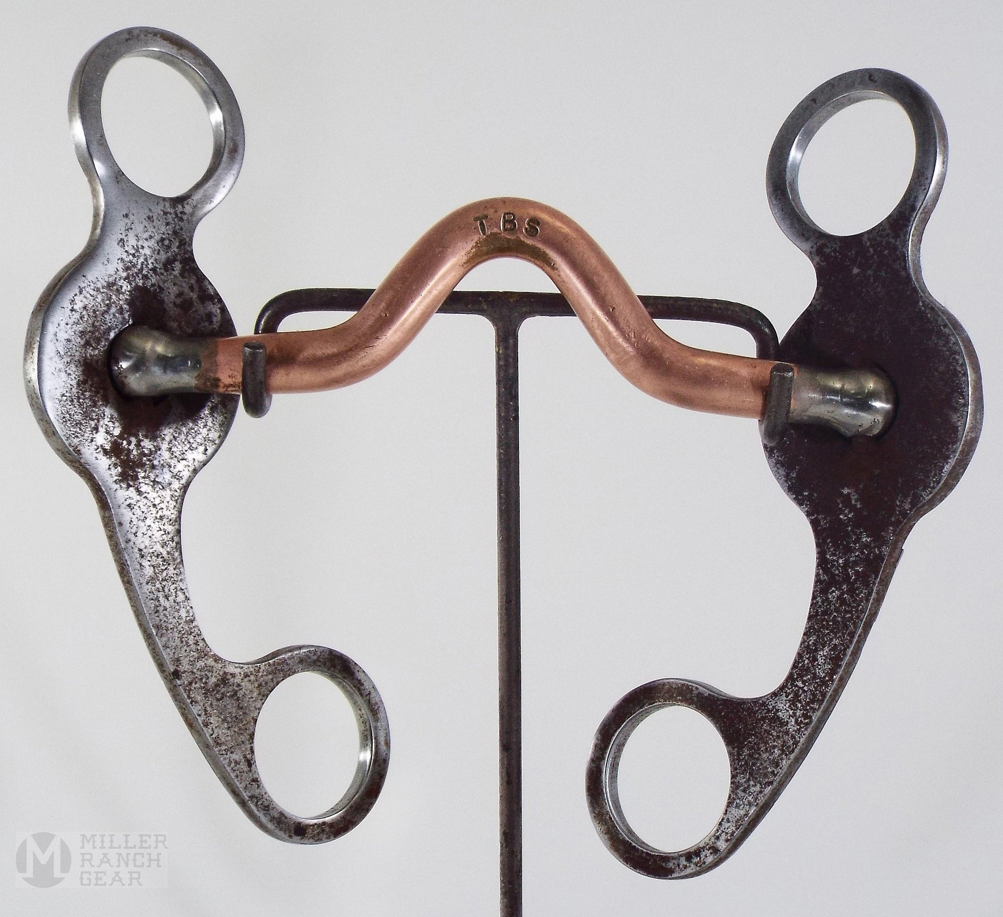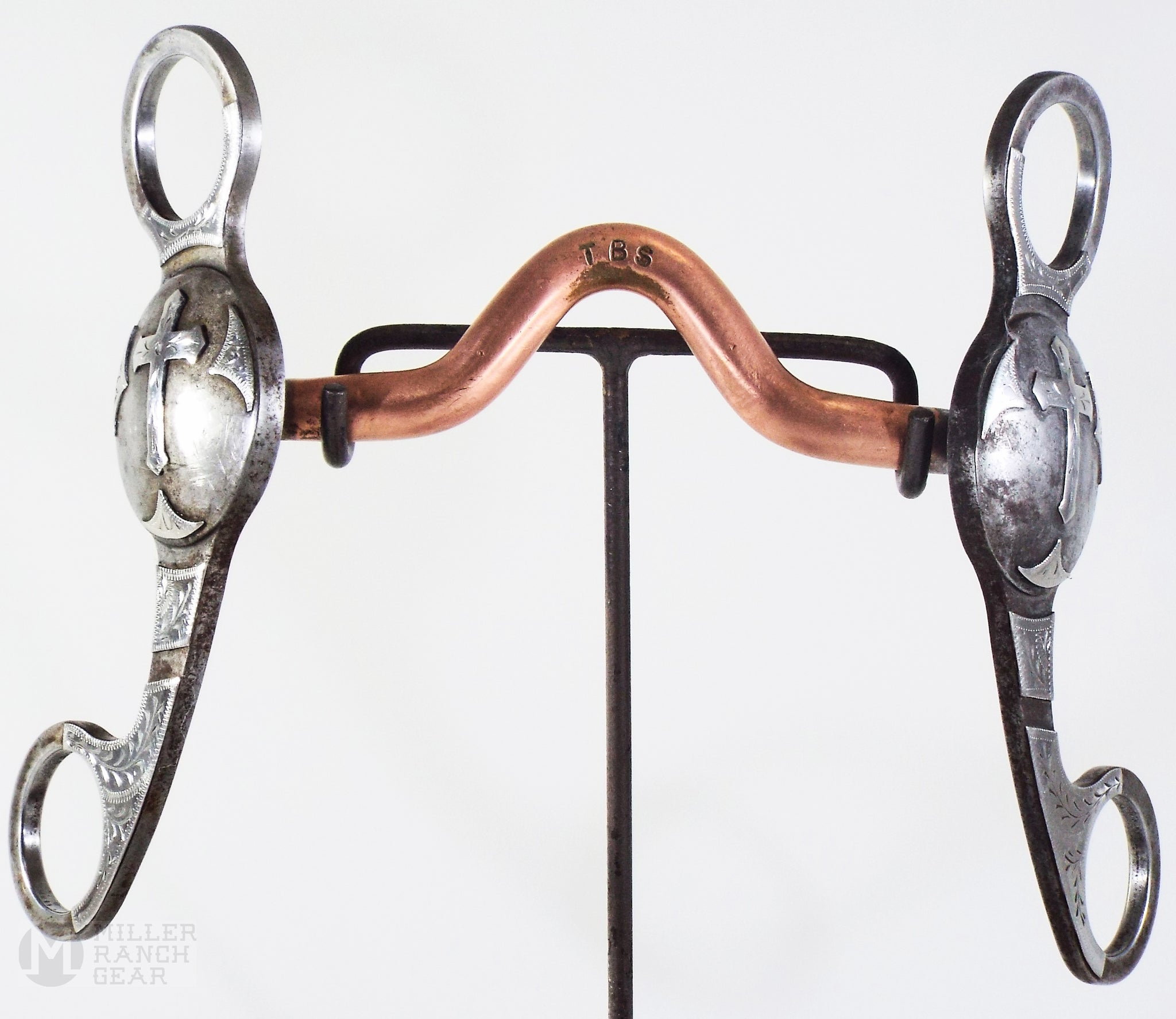 This bit is marked TBS and has a copper medium port mouth with loose cheeks. The bit is mounted with 14 pieces of German silver and a cross motif. The cheek pieces are made from 1/4 inch steel. It has a significant amount of weight and feel. This bit is just beginning to rust.