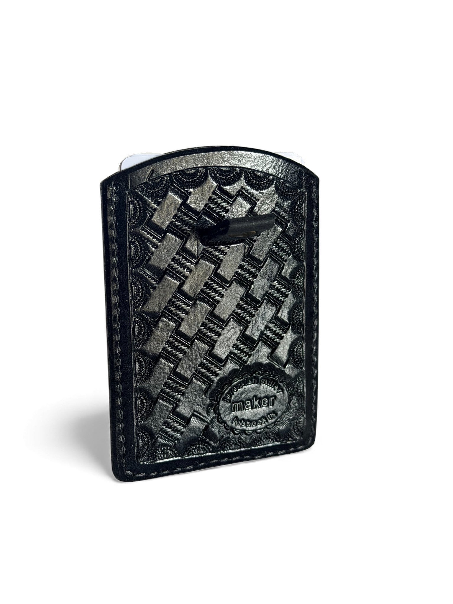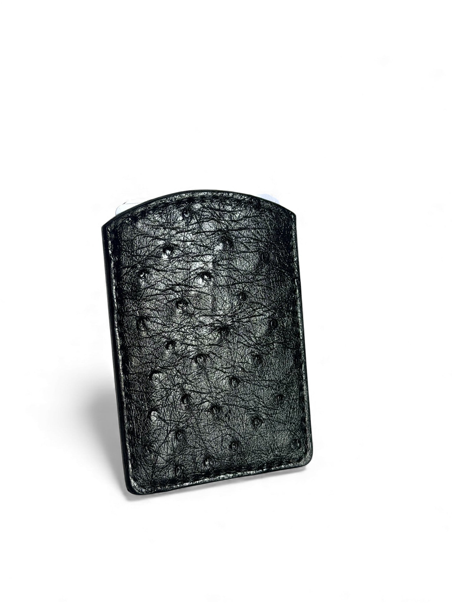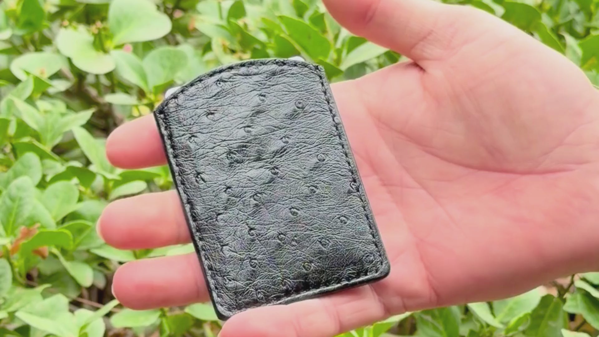 Crafted from premium full quill ostrich leather, this wallet pairs a tooled back panel with a smooth, reliable ribbon-pull mechanism. Pull the ribbon to lift your cards for quick access; push them back down and the ribbon disappears into place. You can tuck folded cash inside too, and the mechanism will raise it out just like a card.