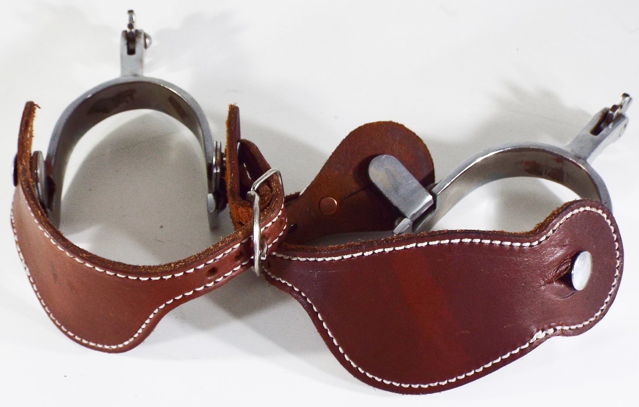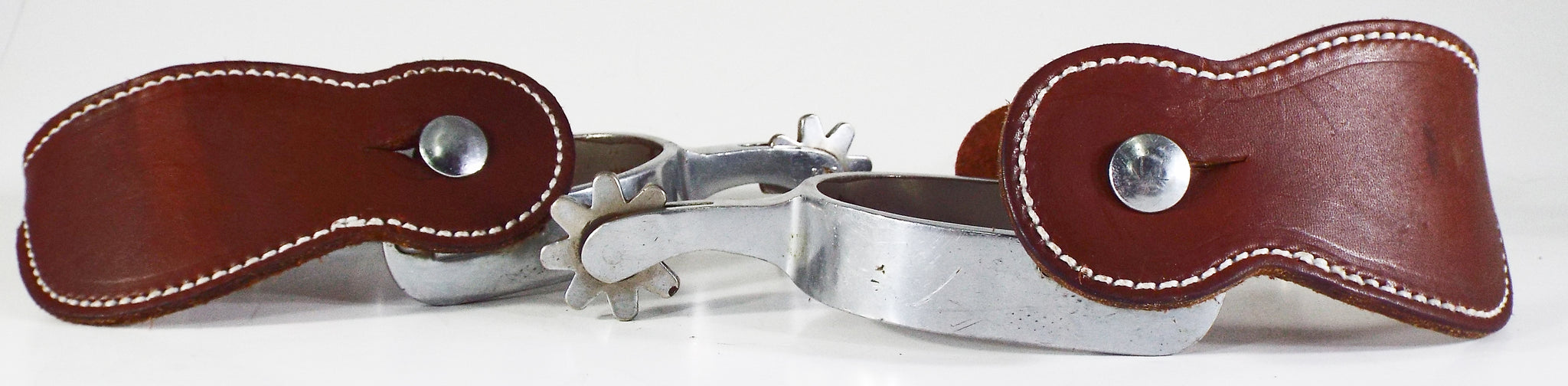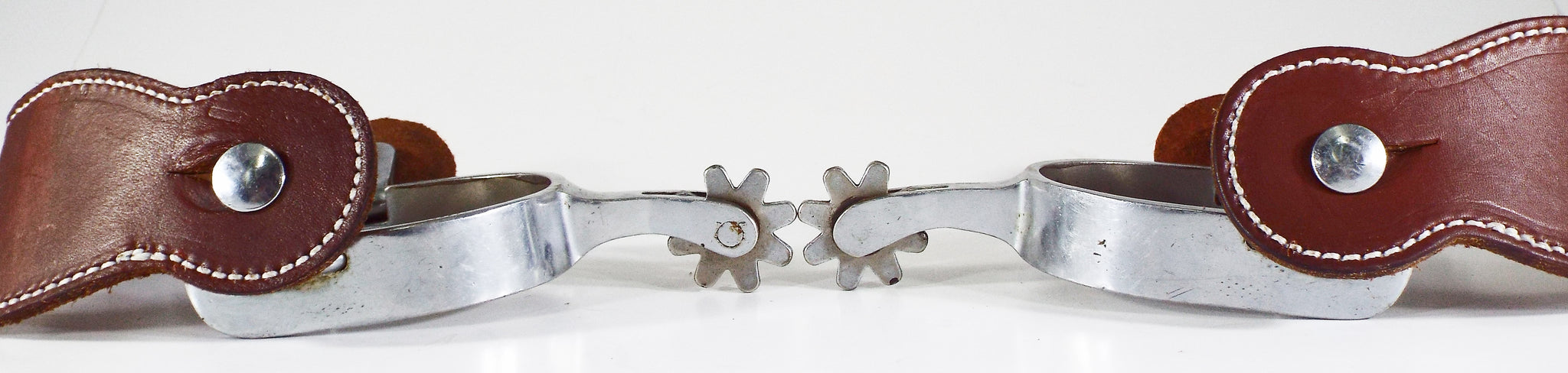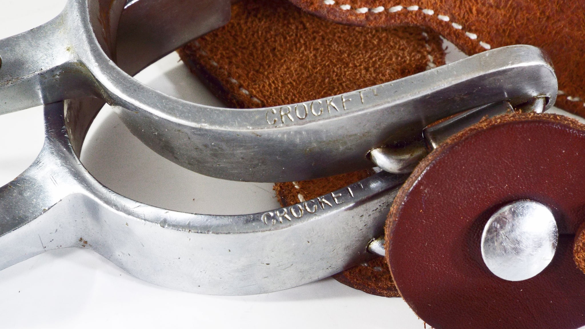 These Crockett spurs are in excellent condition and show very little signs of wear. The shank measures 1 7/8 inch, the band measures 7/8 inch, the 8 point rowel is 1 1/4, and the heel opening is 2 5/8 inch but could be adjusted as needed. These spurs would be great to add to any collection or to put on and wear. They will come with a pair of dark oiled spur straps with nickel buckles. You won't find a nicer example of a 70+ year old spur.