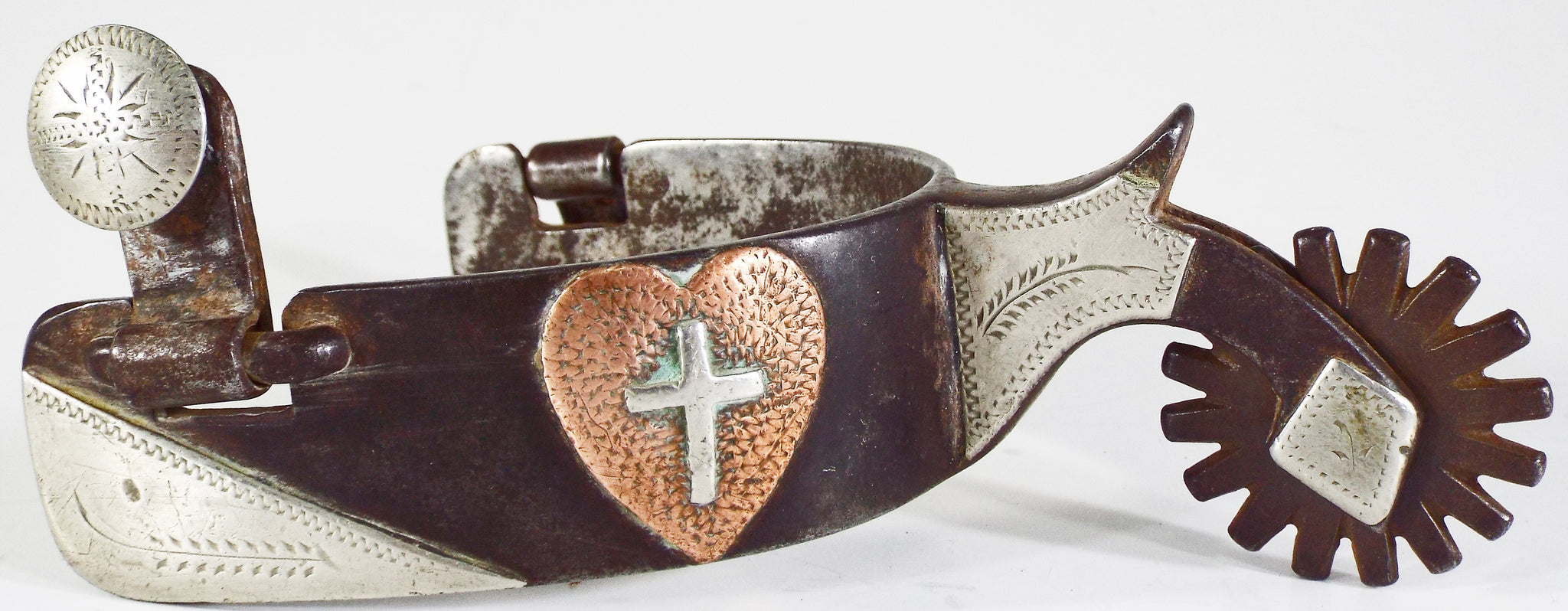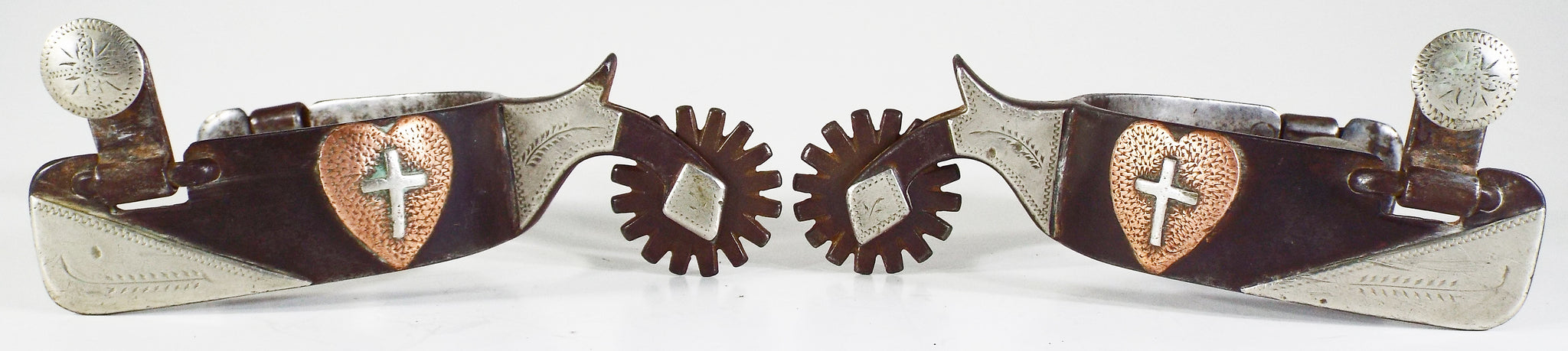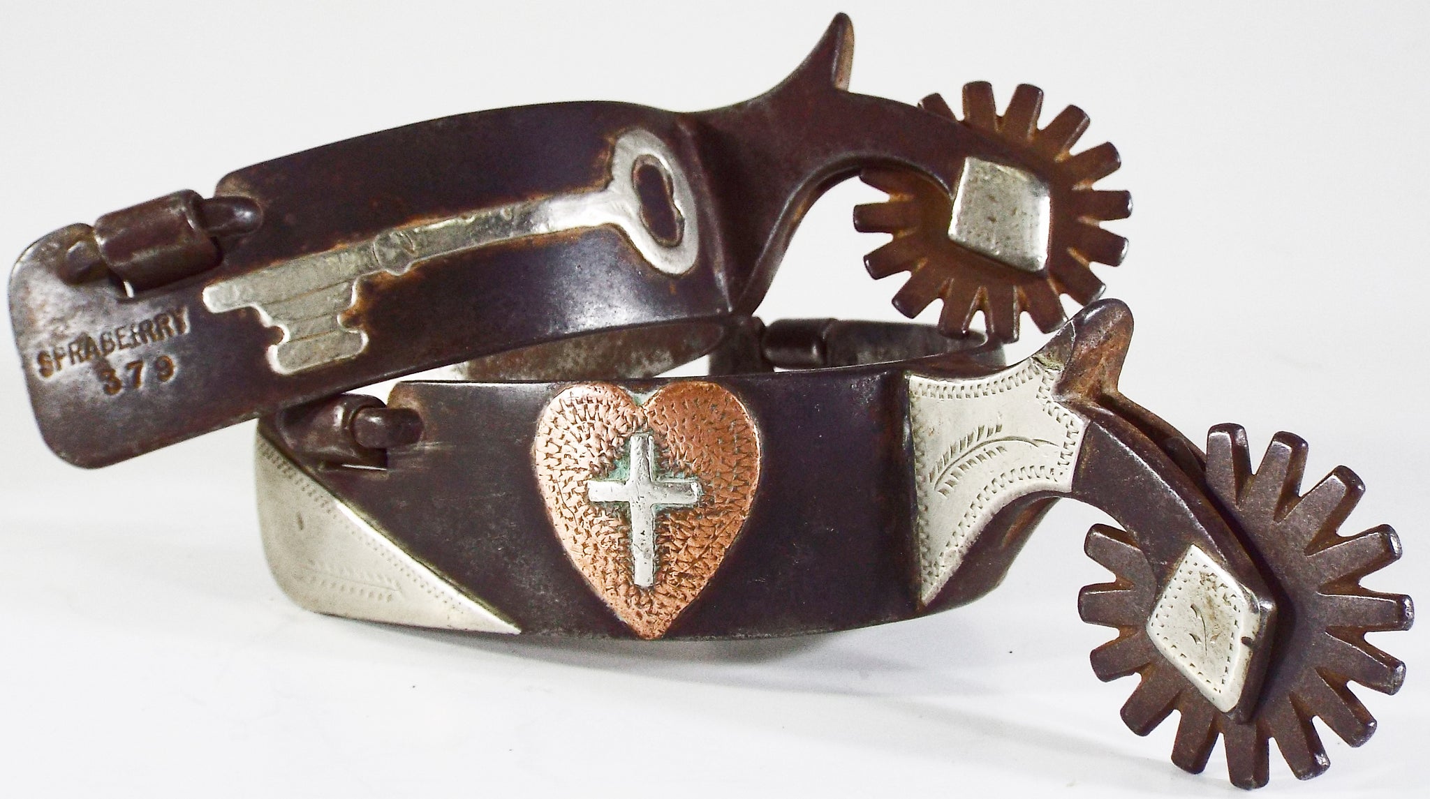This is a double mounted set of Tommy Spraberry spurs that are in good condition but show signs of cowboy use. They have a 1 1/4 band, a 3 1/8 heel opening, a 1 3/4 shank, and a 1 1/2 16 point rowel. They are mounted in 18 pieces of German silver and copper. One side features a copper heart with a cross and the other side has a key. The swingers are in good shape. The rowel pin is 80% and the rowel hole is double sized. Tommy Spraberry is a highly sought after and collected maker and West Texas cowboy. This would be a nice pair to put on the shelf or go use. The only notable flaw in the spurs is a 1/8 inch piece of silver that is chipped off of the very tip of the chap guard. All other mountings are in tact and tight.