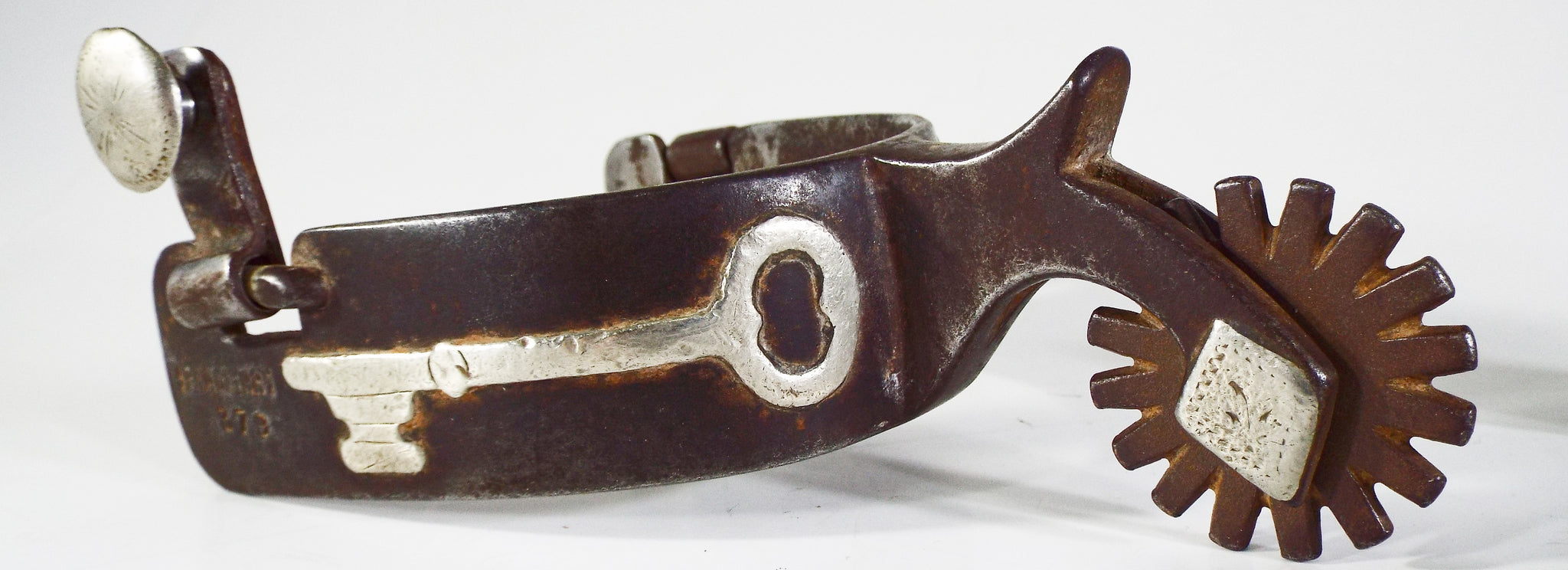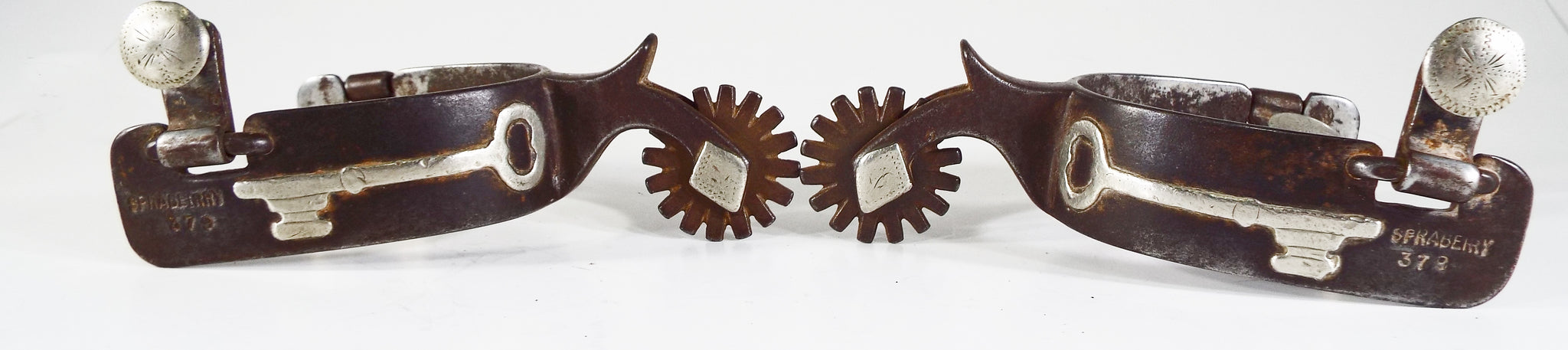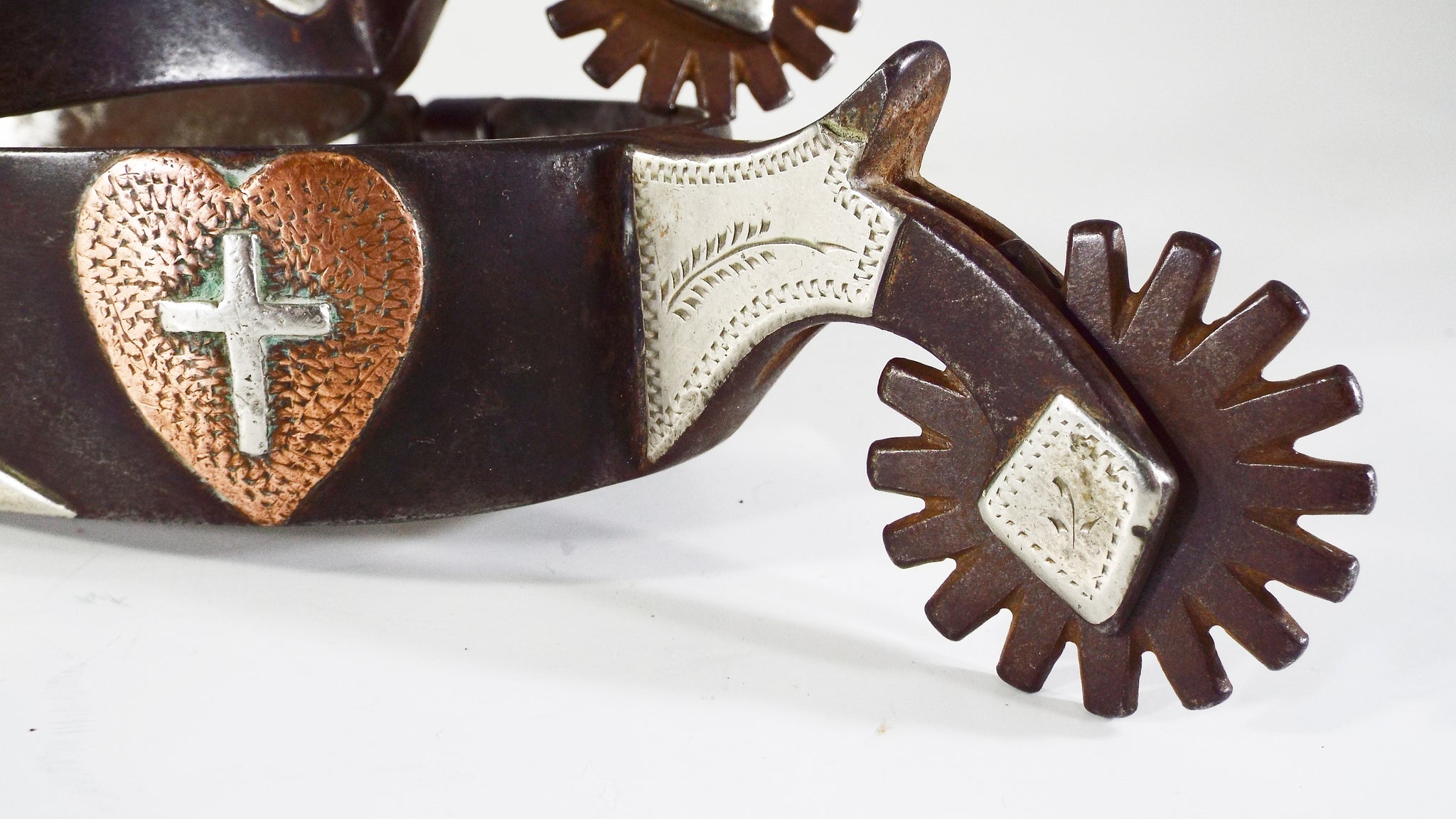 This is a double mounted set of Tommy Spraberry spurs that are in good condition but show signs of cowboy use. They have a 1 1/4 band, a 3 1/8 heel opening, a 1 3/4 shank, and a 1 1/2 16 point rowel. They are mounted in 18 pieces of German silver and copper. One side features a copper heart with a cross and the other side has a key. The swingers are in good shape. The rowel pin is 80% and the rowel hole is double sized. Tommy Spraberry is a highly sought after and collected maker and West Texas cowboy. This would be a nice pair to put on the shelf or go use. The only notable flaw in the spurs is a 1/8 inch piece of silver that is chipped off of the very tip of the chap guard. All other mountings are in tact and tight.