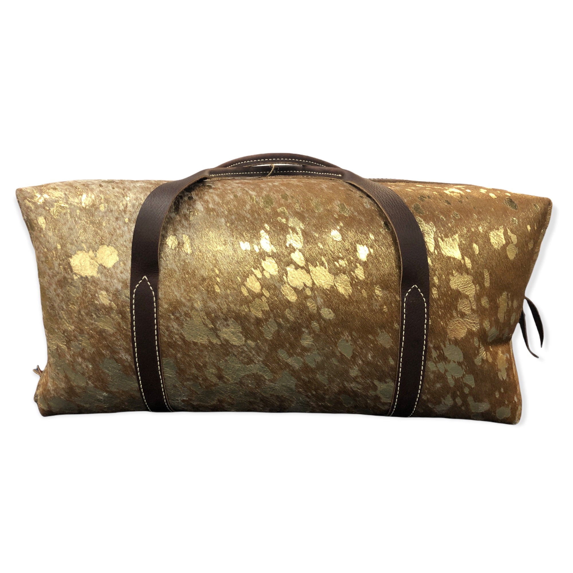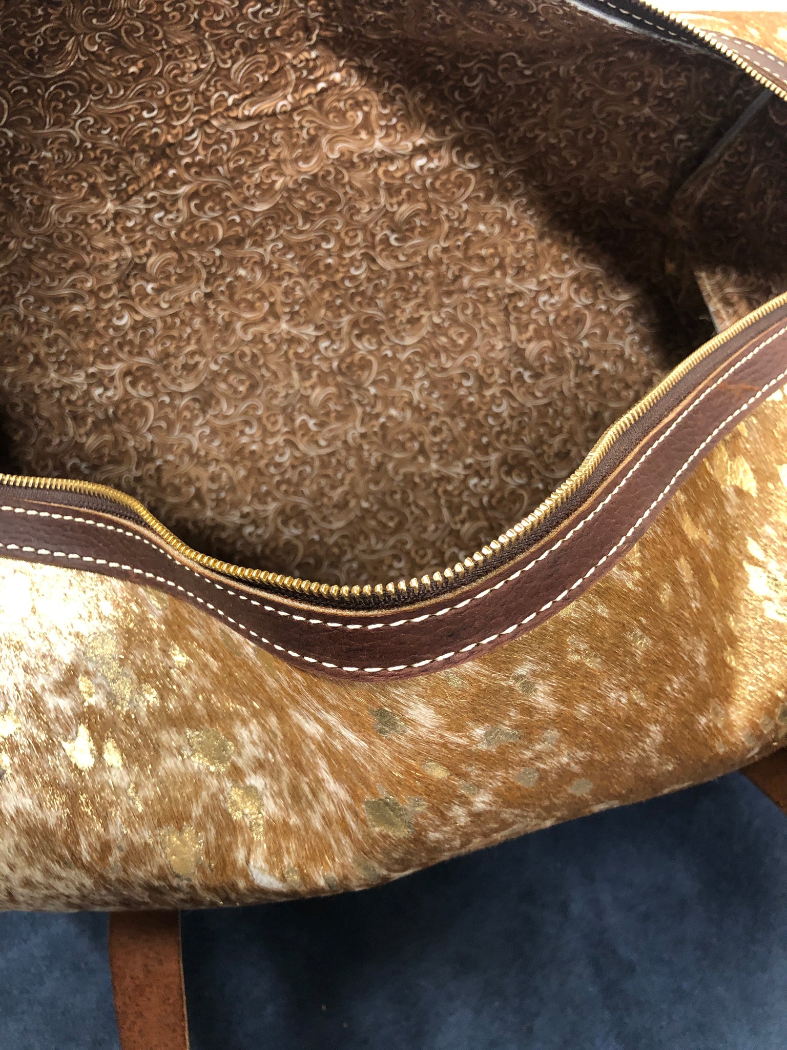 This large size duffel is made from gold acid washed hair on hide and lined with paisley cotton fabric. It measures 19” long and is 10” deep by 10” wide. The handles and trim leather is chocolate oil tanned leather. One photo features a small overnight bag for comparison. The bag was made in our shop in Lubbock, Tx.