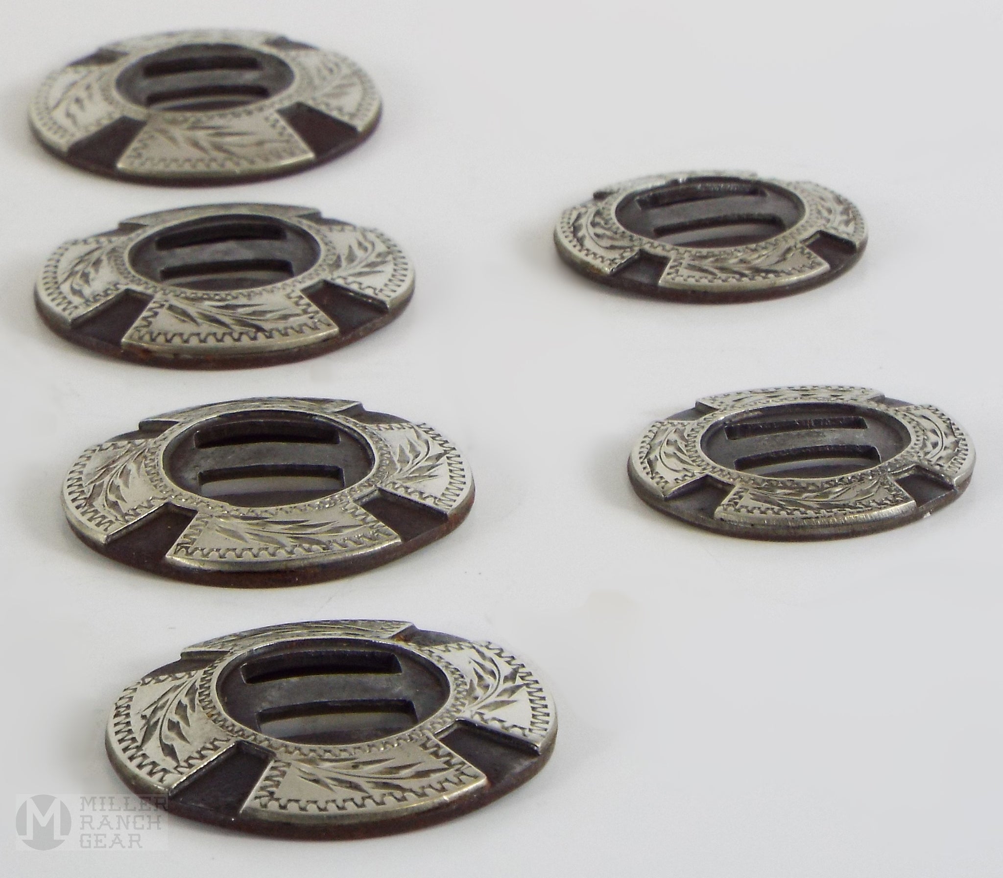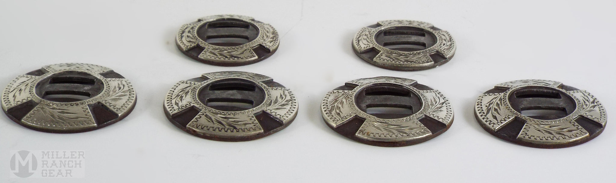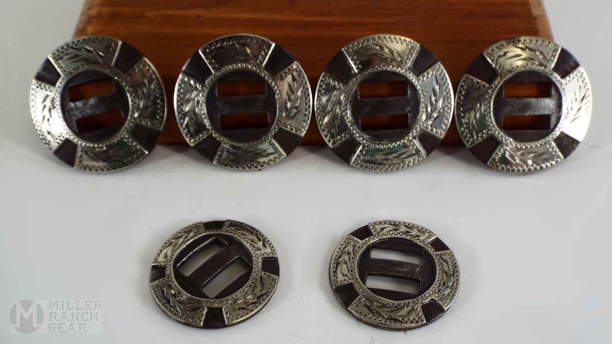 This is a slightly used set of Jayson Jones slotted conchos. There are four 1.5 inch and two 1.25 inch conchos. This set is steel mounted in silver with western wheat stalk engraving. The slots are .5 inch. The silver is in great shape and the steel has a light natural patina. Jayson is an outstanding maker out of Quanah, TX and these carry his older mark.