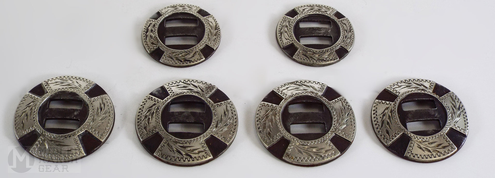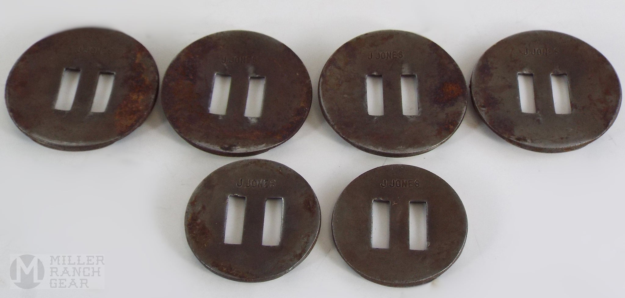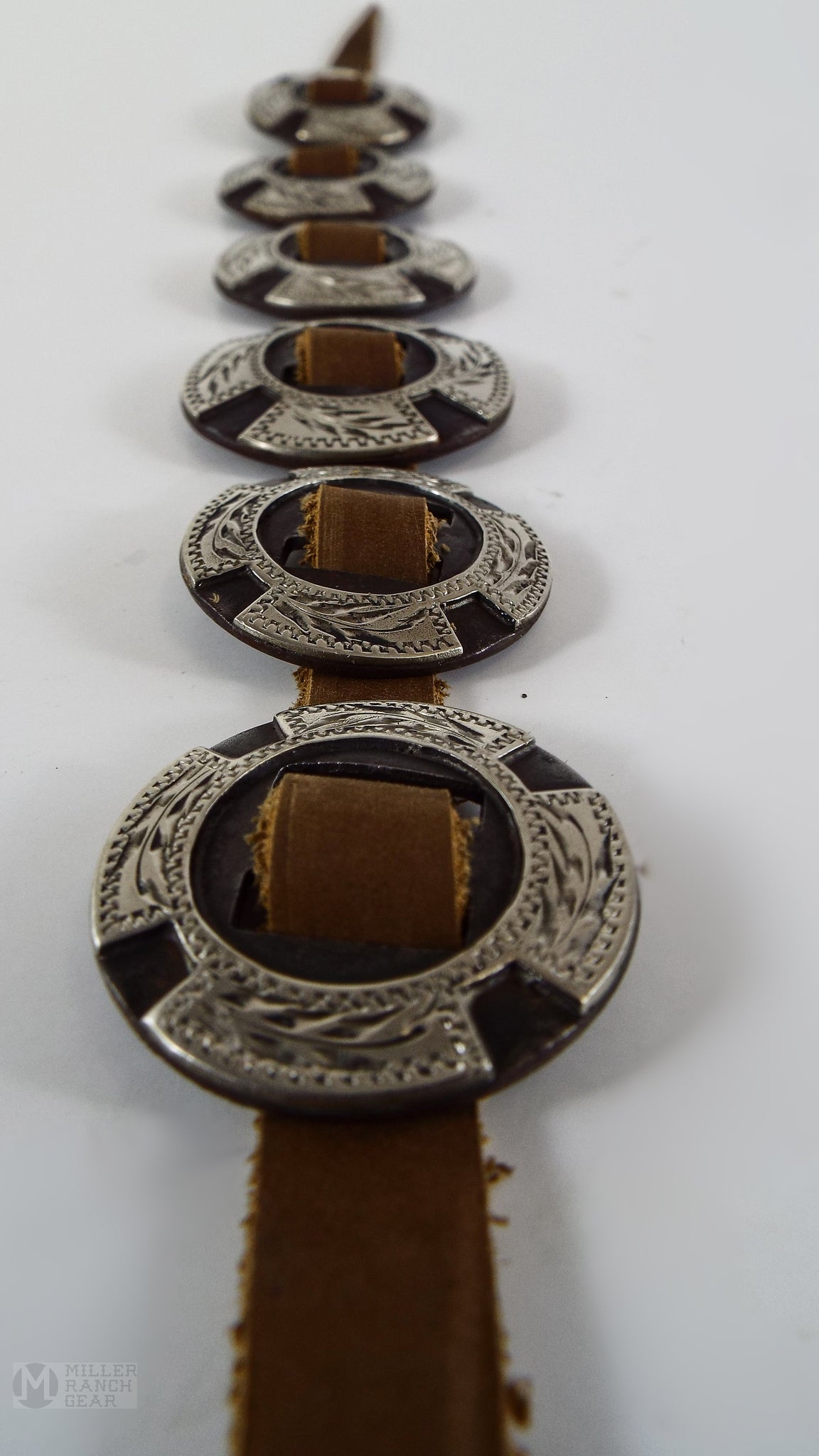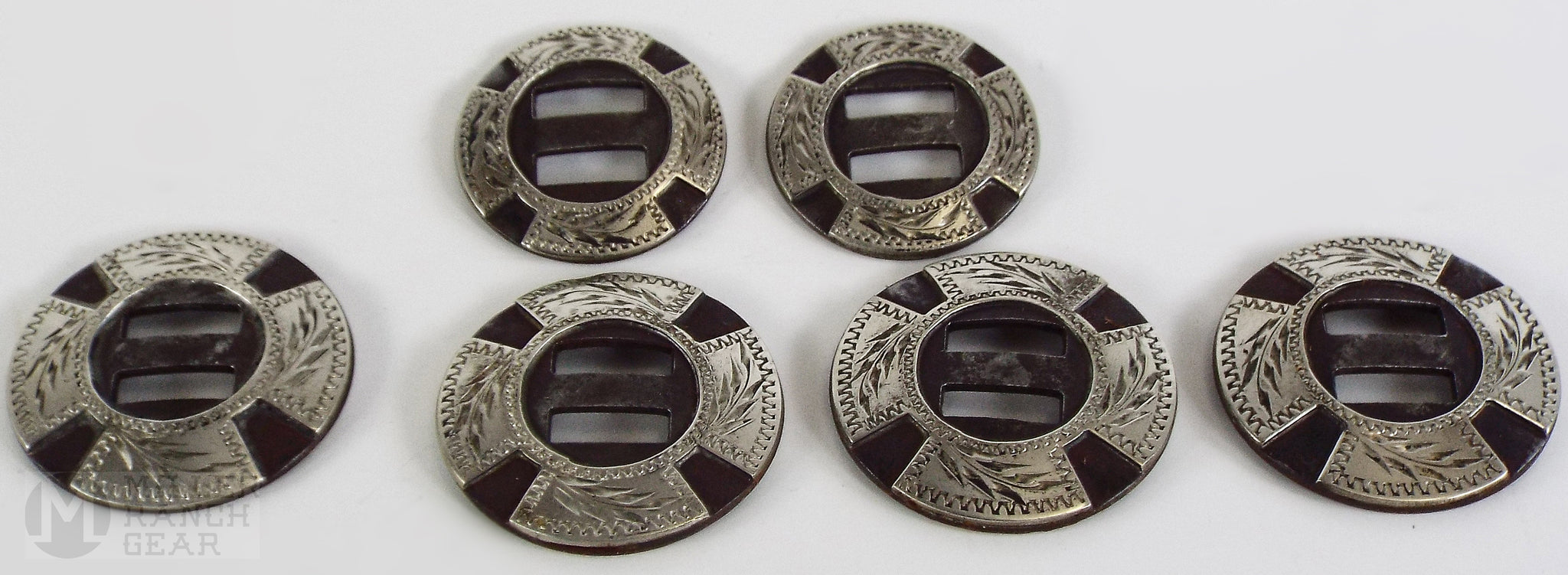 This is a slightly used set of Jayson Jones slotted conchos. There are four 1.5 inch and two 1.25 inch conchos. This set is steel mounted in silver with western wheat stalk engraving. The slots are .5 inch. The silver is in great shape and the steel has a light natural patina. Jayson is an outstanding maker out of Quanah, TX and these carry his older mark.