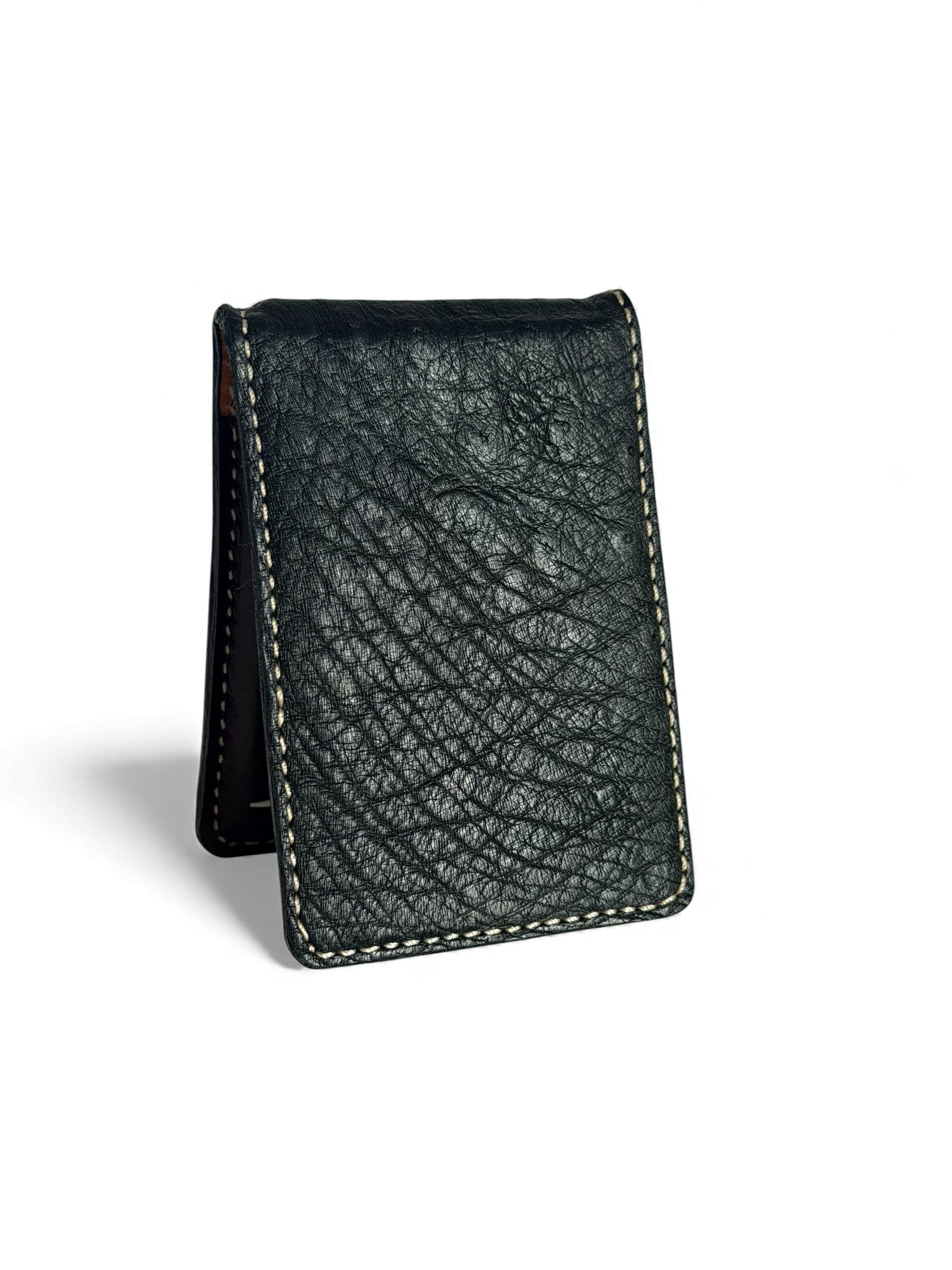 The textured ostrich hide breaks in beautifully, forming to your pocket and developing a rich patina with everyday use. The built-in toothpick holder adds a small but useful bit of function. Thoughtfully minimalistic, every cut and stitch is made to save as much size and thickness as possible while still giving you solid, dependable function.