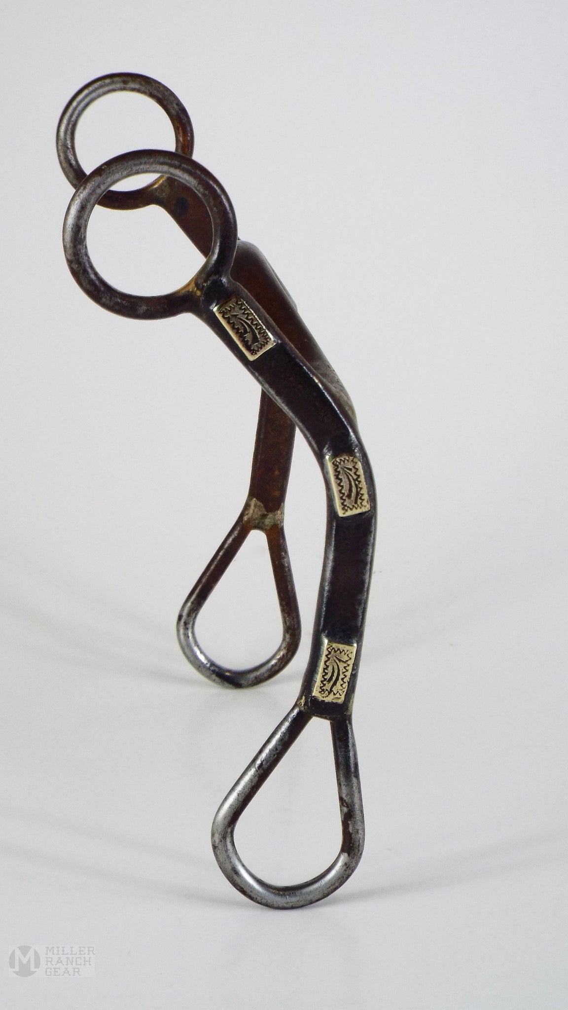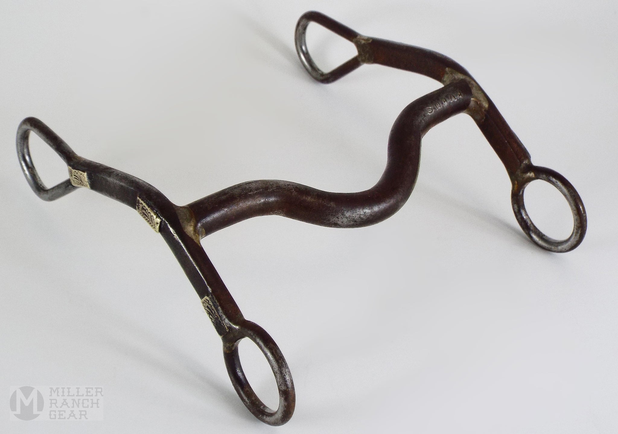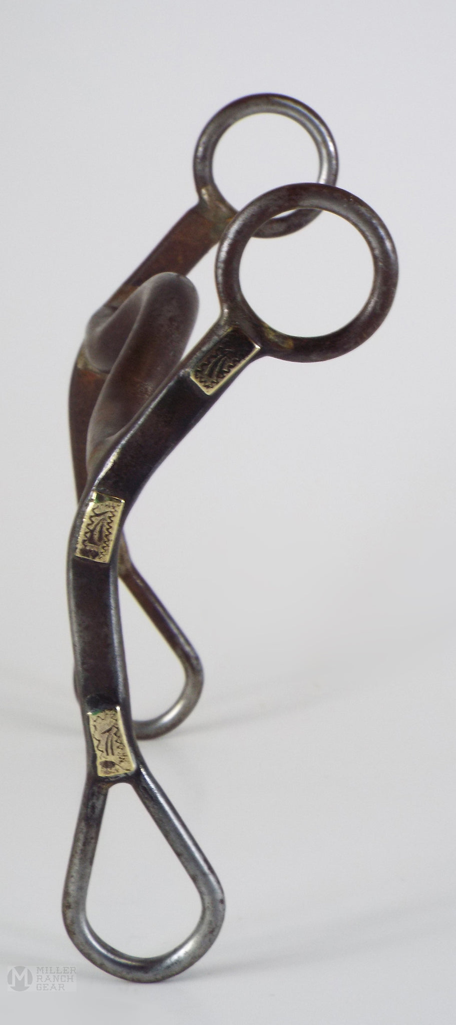 This is a low port solid mouth bit marked EVENS. It has a 6.5 inch cheek and a 5 inch mouth. The port has 7/8 inch rise. It has rich patina and is mounted with six pieces of engraved brass. I am not familiar with the maker but it is well made and has good balance. The bit lays flat on a piece of glass.