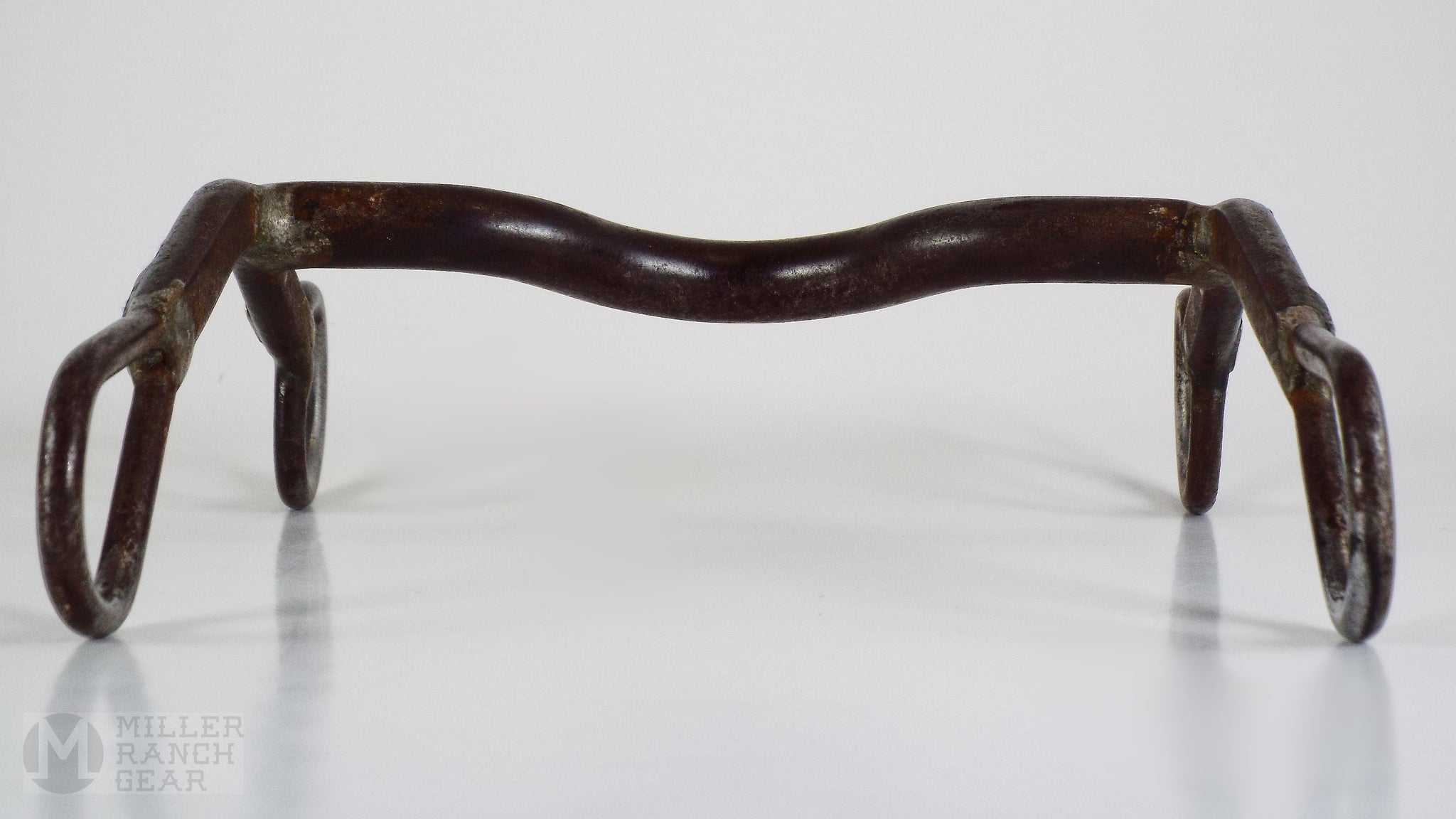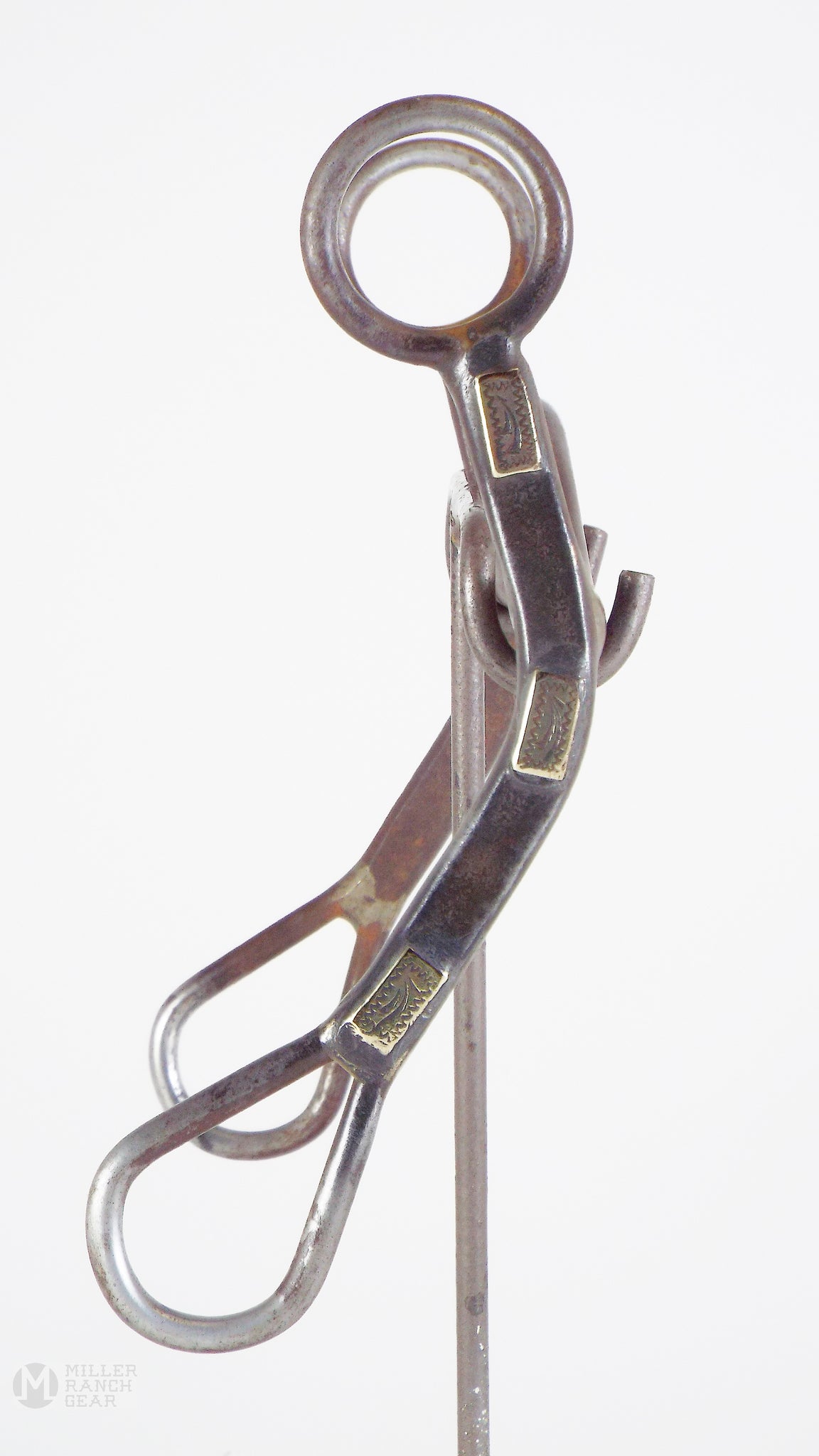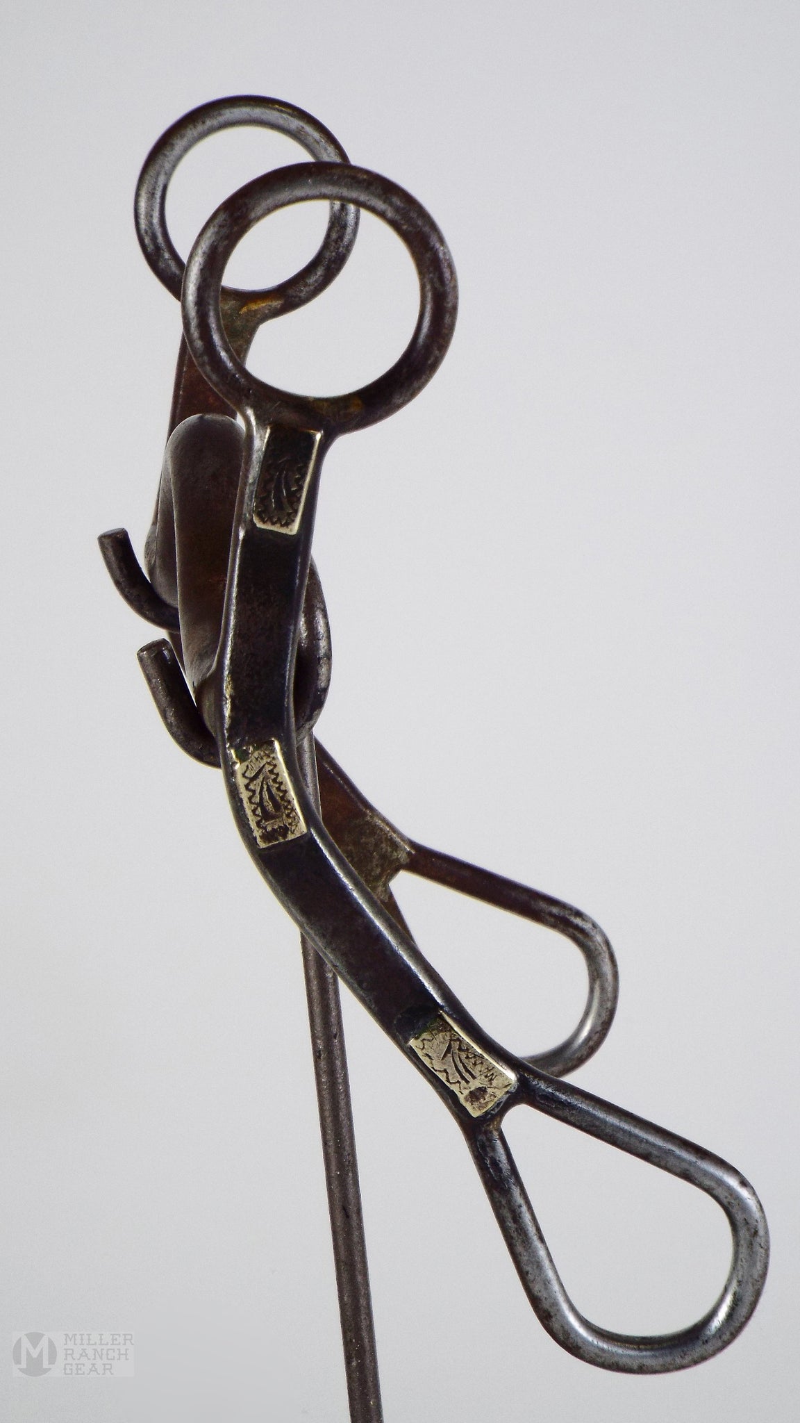 This is a low port solid mouth bit marked EVENS. It has a 6.5 inch cheek and a 5 inch mouth. The port has 7/8 inch rise. It has rich patina and is mounted with six pieces of engraved brass. I am not familiar with the maker but it is well made and has good balance. The bit lays flat on a piece of glass.