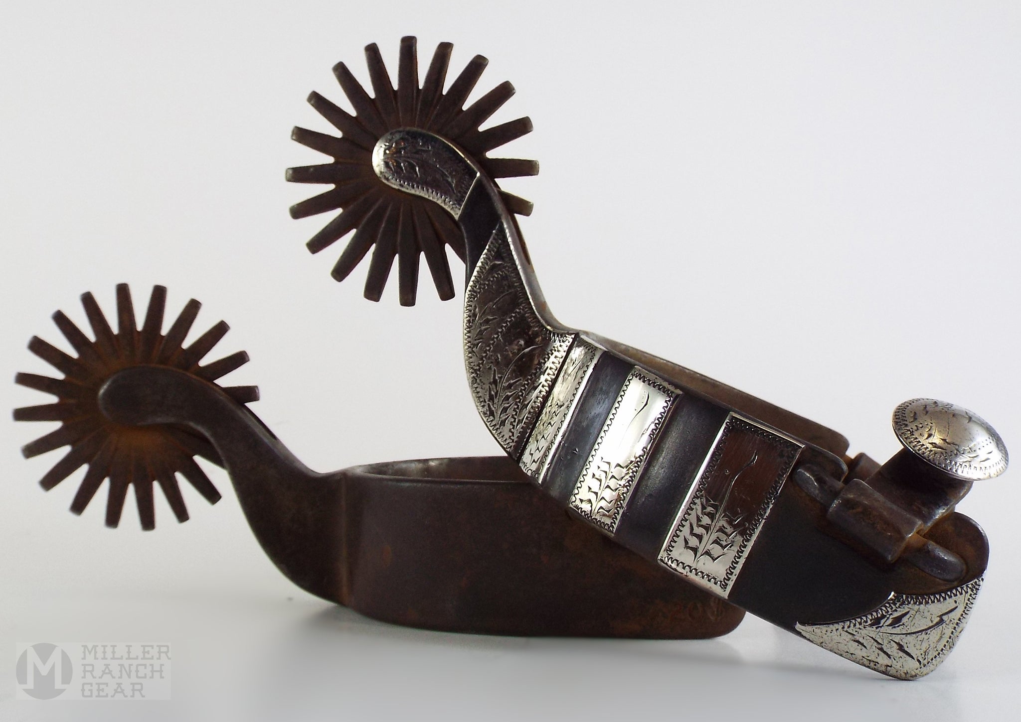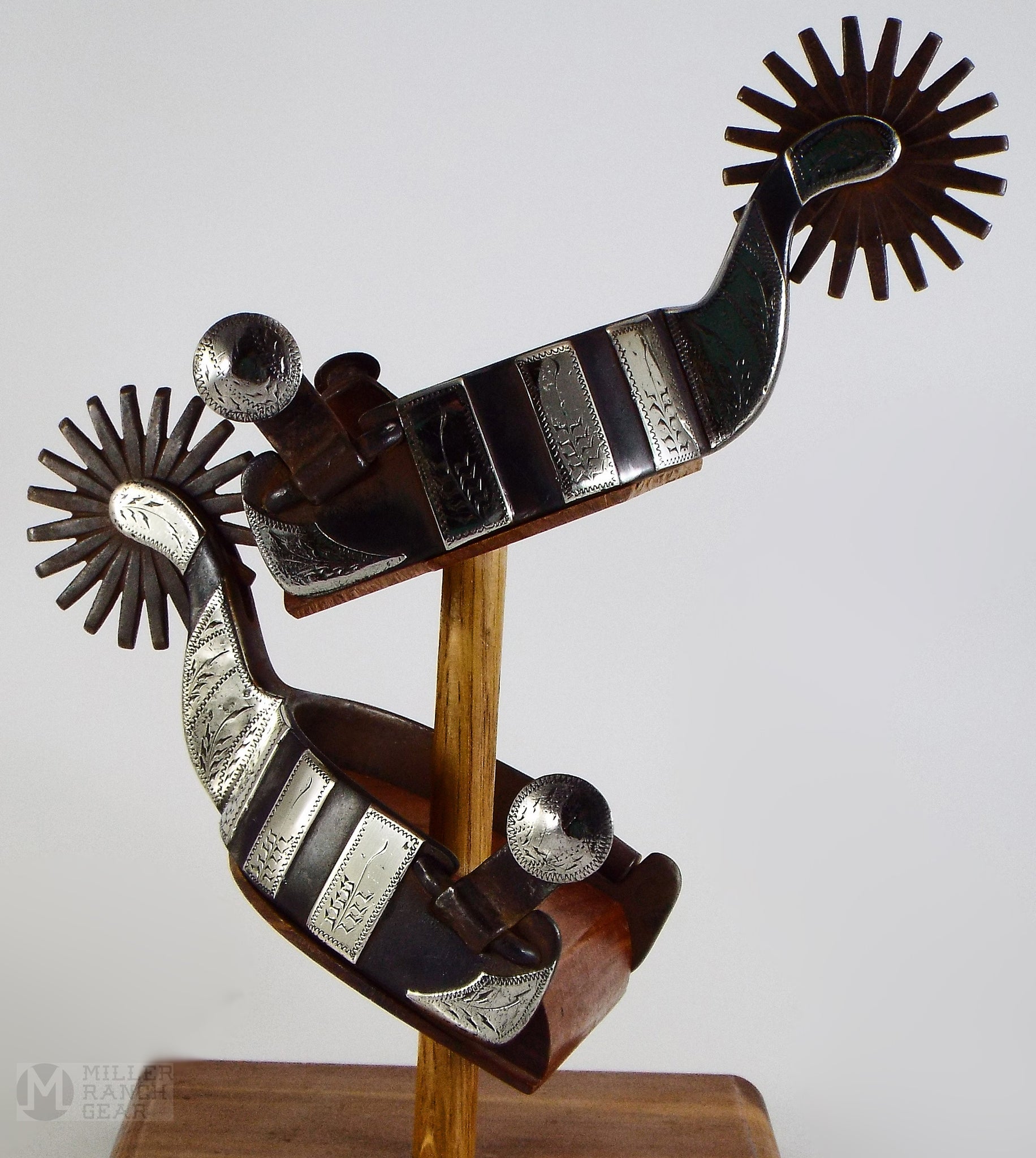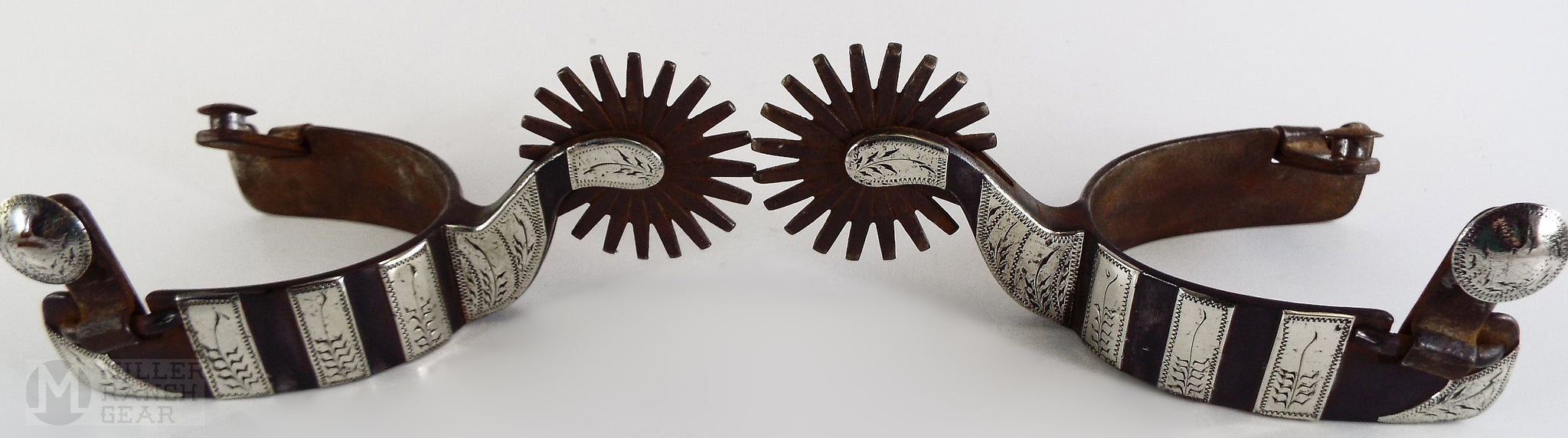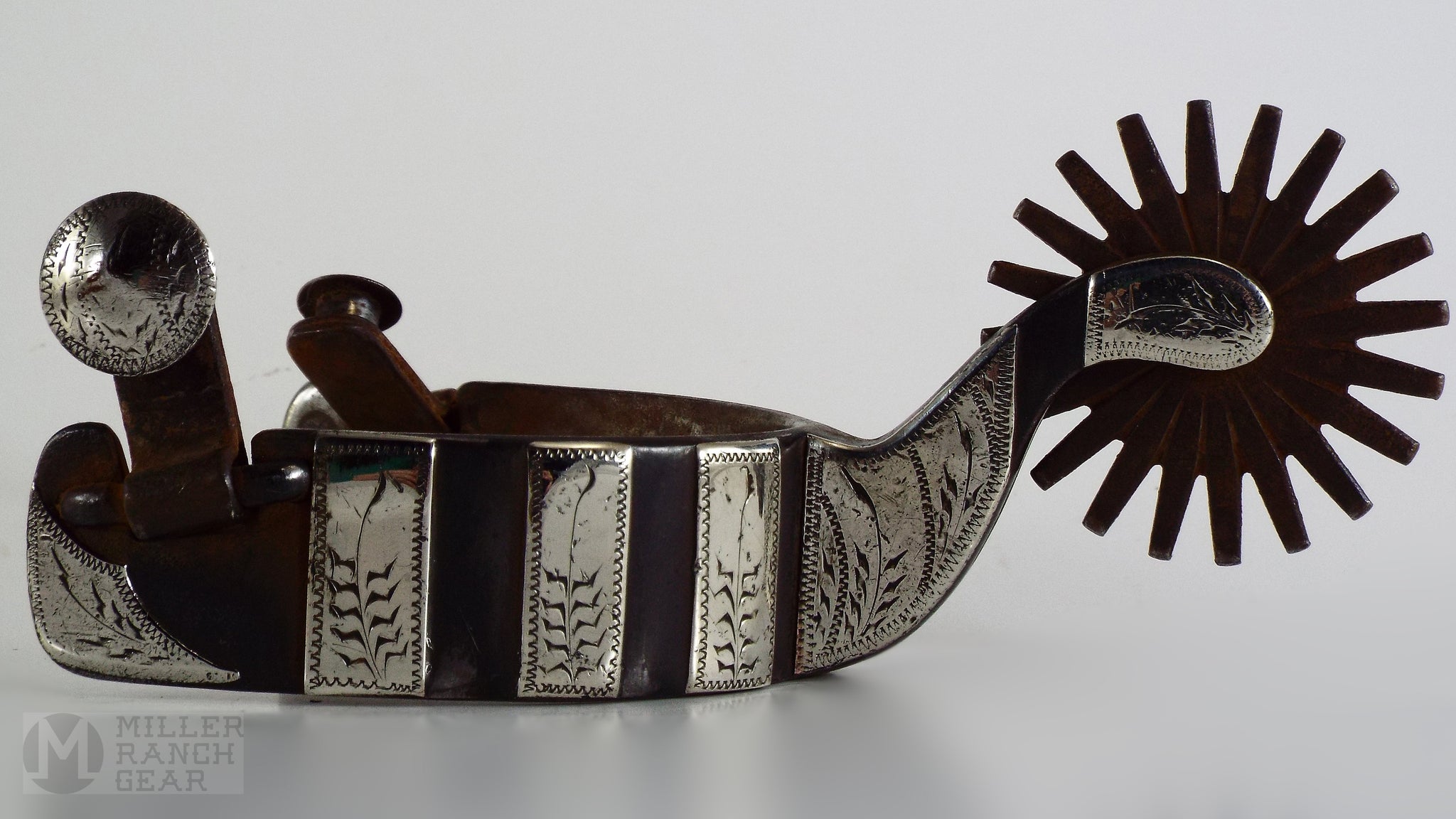 This is a pair of single mounted Wayne Dollar spurs. These are mounted in 14 pieces of German silver with wheat stock engraving. This set has 1.25 inch band and a 2.25 inch shank. They have a 20 point 2.25 inch rowel. Everything about these spurs is tight and alright. Wayne's work is collectible and sought after. He was a part of the Dollar & Dyess duo and is no longer making. The three bars on the band are in place of where a brand was originally. This pair rings as loud as any I have ever heard. They are marked 420 $. Wayne Dollar's silver and metal work was truly ahead of his time. Feel free to call us if you are interested, I know where to find the buckles to make this a matching set.