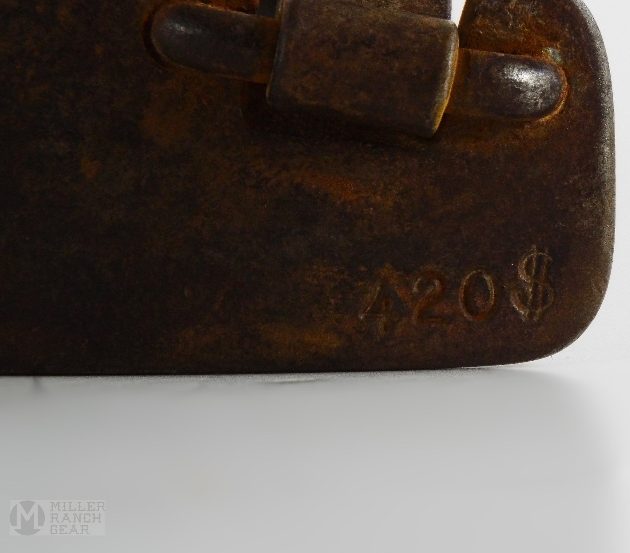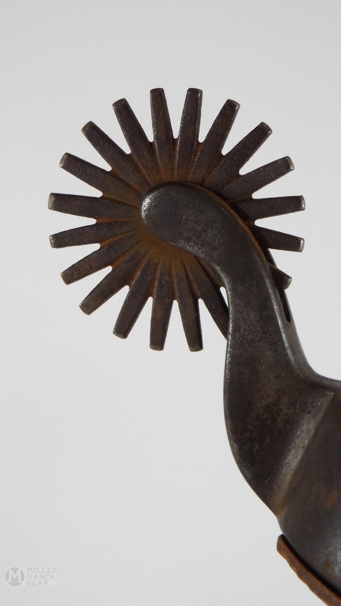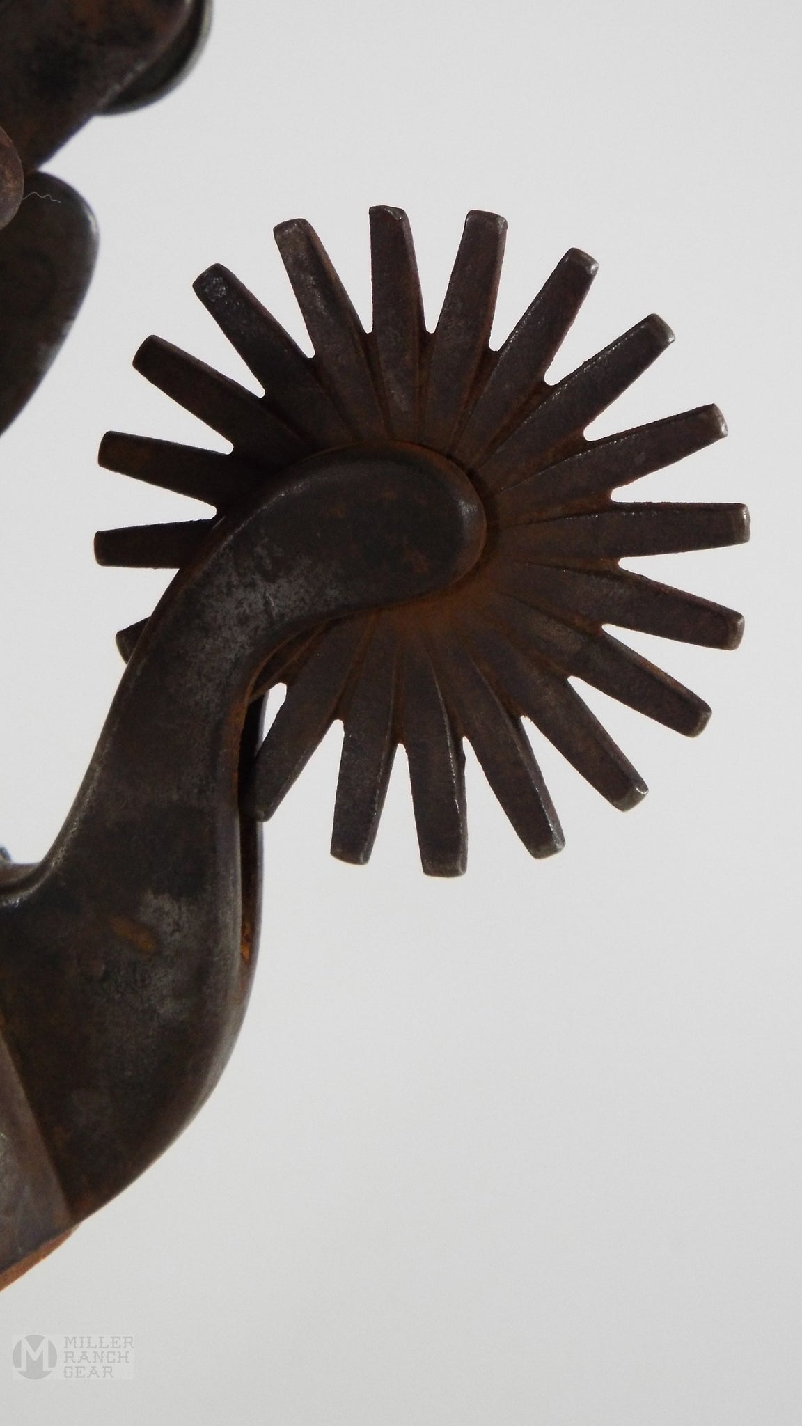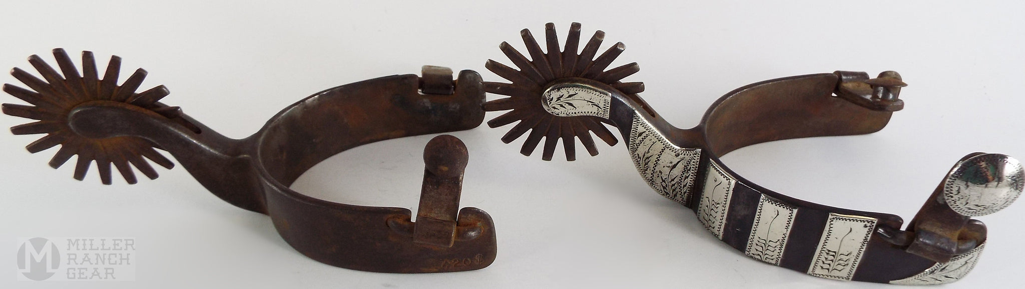 This is a pair of single mounted Wayne Dollar spurs. These are mounted in 14 pieces of German silver with wheat stock engraving. This set has 1.25 inch band and a 2.25 inch shank. They have a 20 point 2.25 inch rowel. Everything about these spurs is tight and alright. Wayne's work is collectible and sought after. He was a part of the Dollar & Dyess duo and is no longer making. The three bars on the band are in place of where a brand was originally. This pair rings as loud as any I have ever heard. They are marked 420 $. Wayne Dollar's silver and metal work was truly ahead of his time. Feel free to call us if you are interested, I know where to find the buckles to make this a matching set.